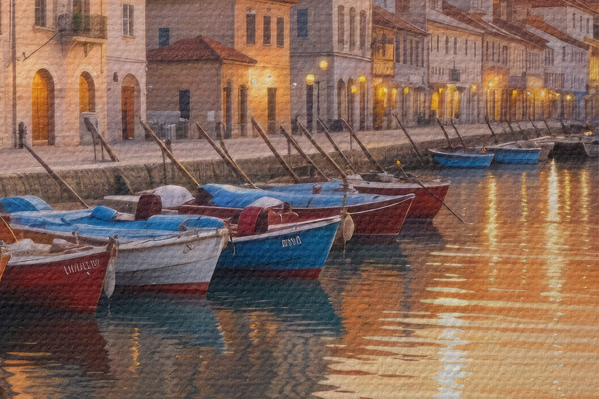 Кругла картина Італійське прибережне місто на заході сонця з барвистими будівлями вздовж набережної та човнами, що пливуть у спокійних водах r40150