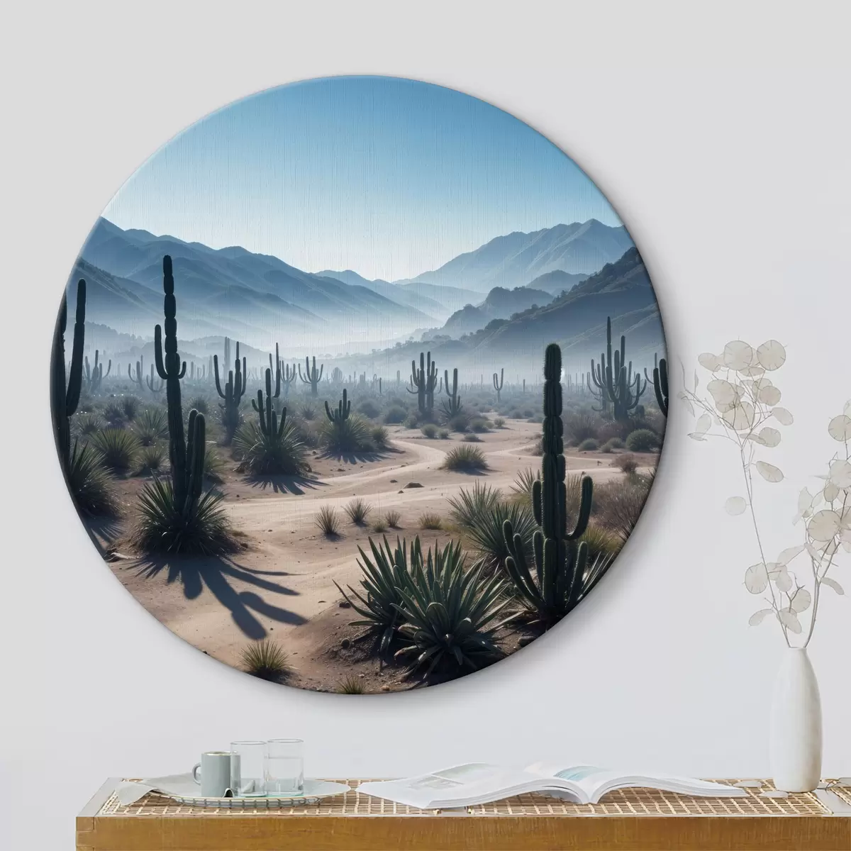 Кругла картина Пустельний ландшафт із високими кактусами та юками на передньому плані, оточений туманними горами Nr r40153
