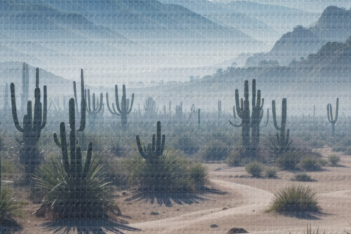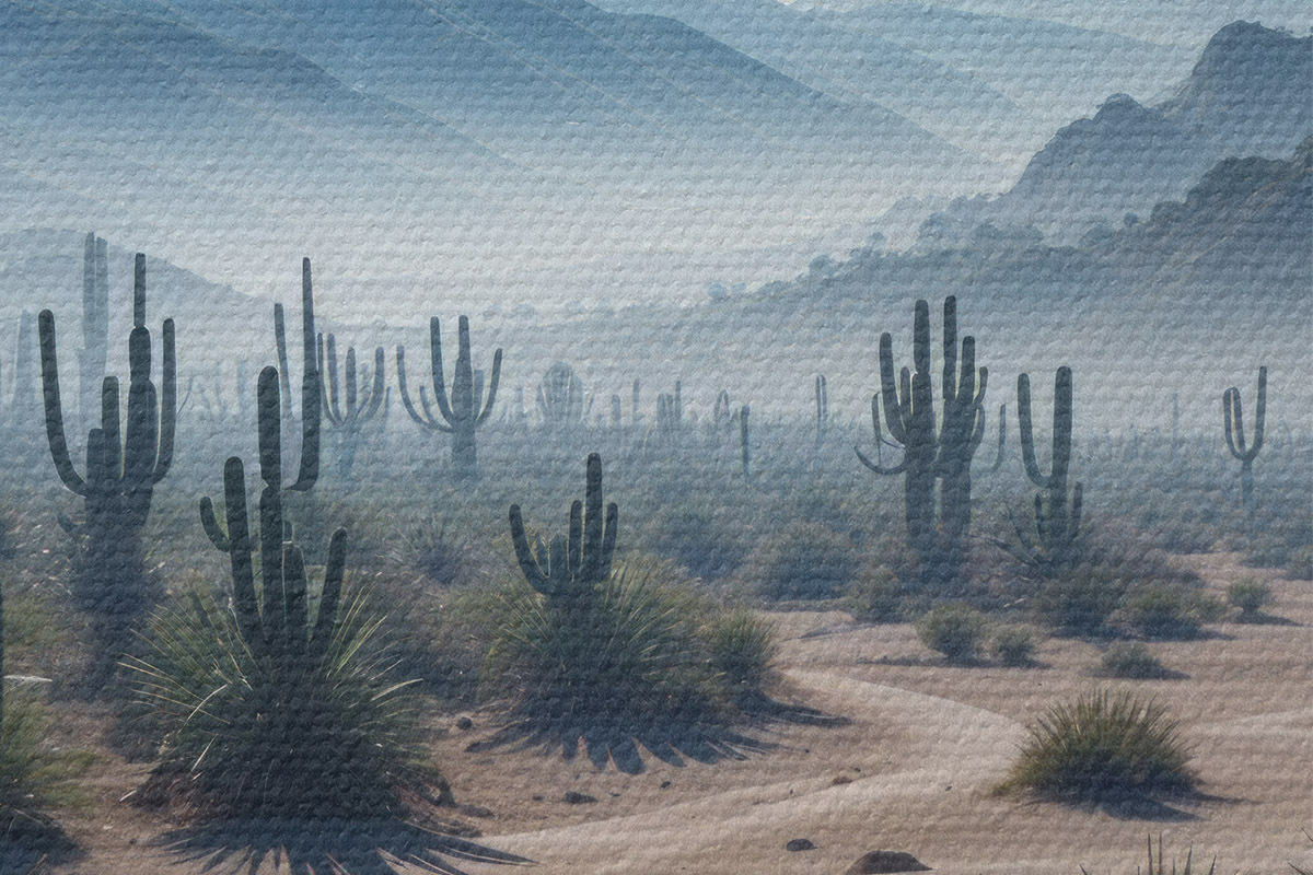 Кругла картина Пустельний ландшафт із високими кактусами та юками на передньому плані, оточений туманними горами r40153