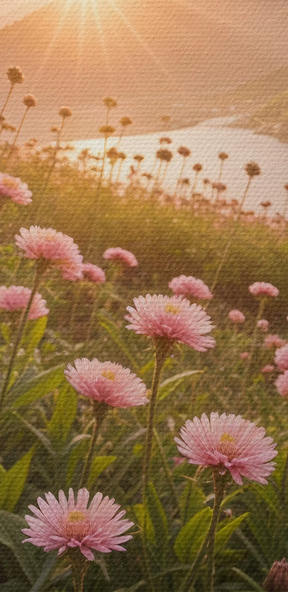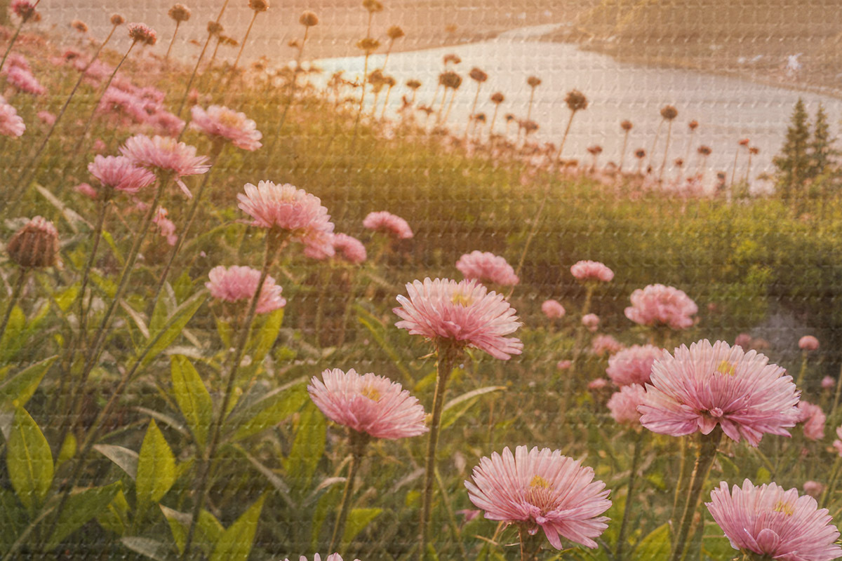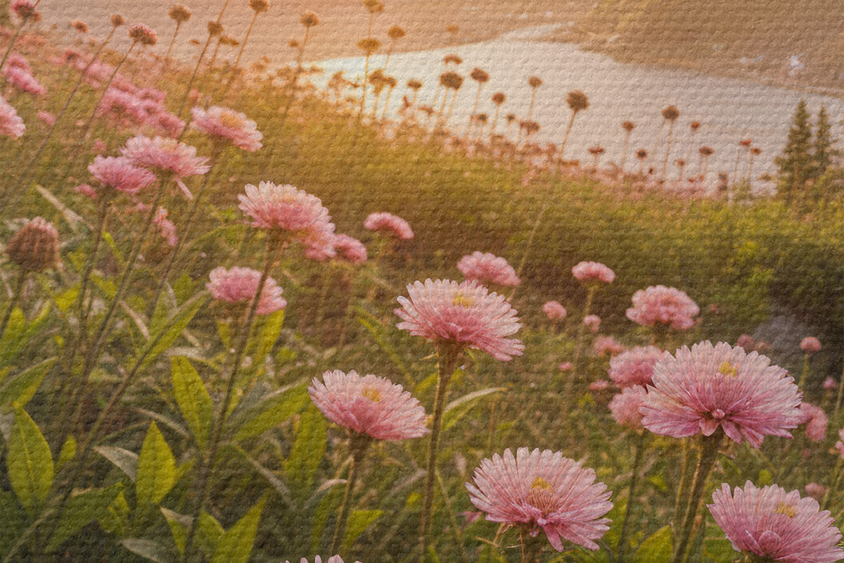 Кругла картина Поле рожевих квітів, схожих на ромашку, на передньому плані та великий гірський масив на задньому плані Nr r40154