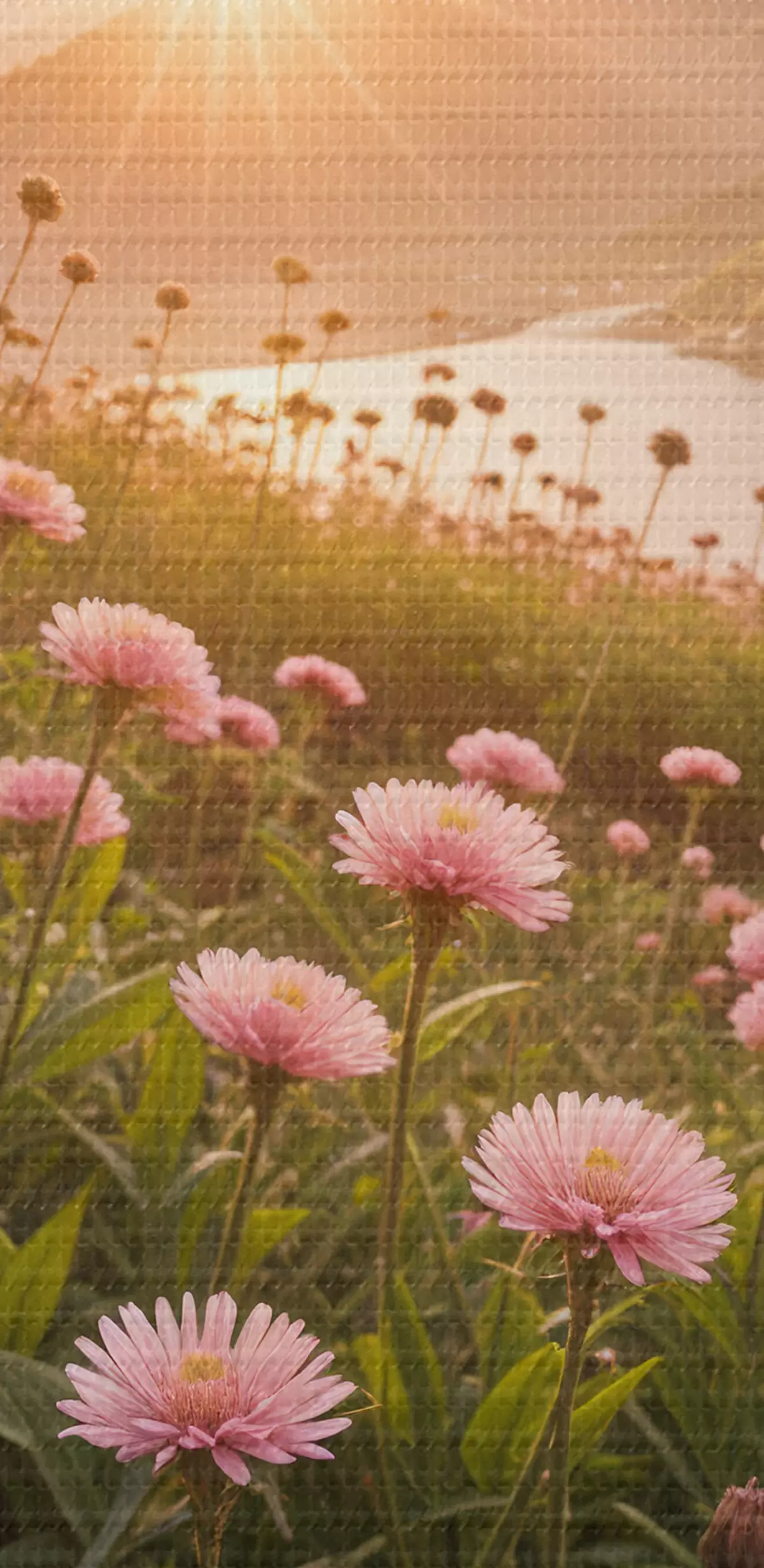 Кругла картина Поле рожевих квітів, схожих на ромашку, на передньому плані та великий гірський масив на задньому плані r40154