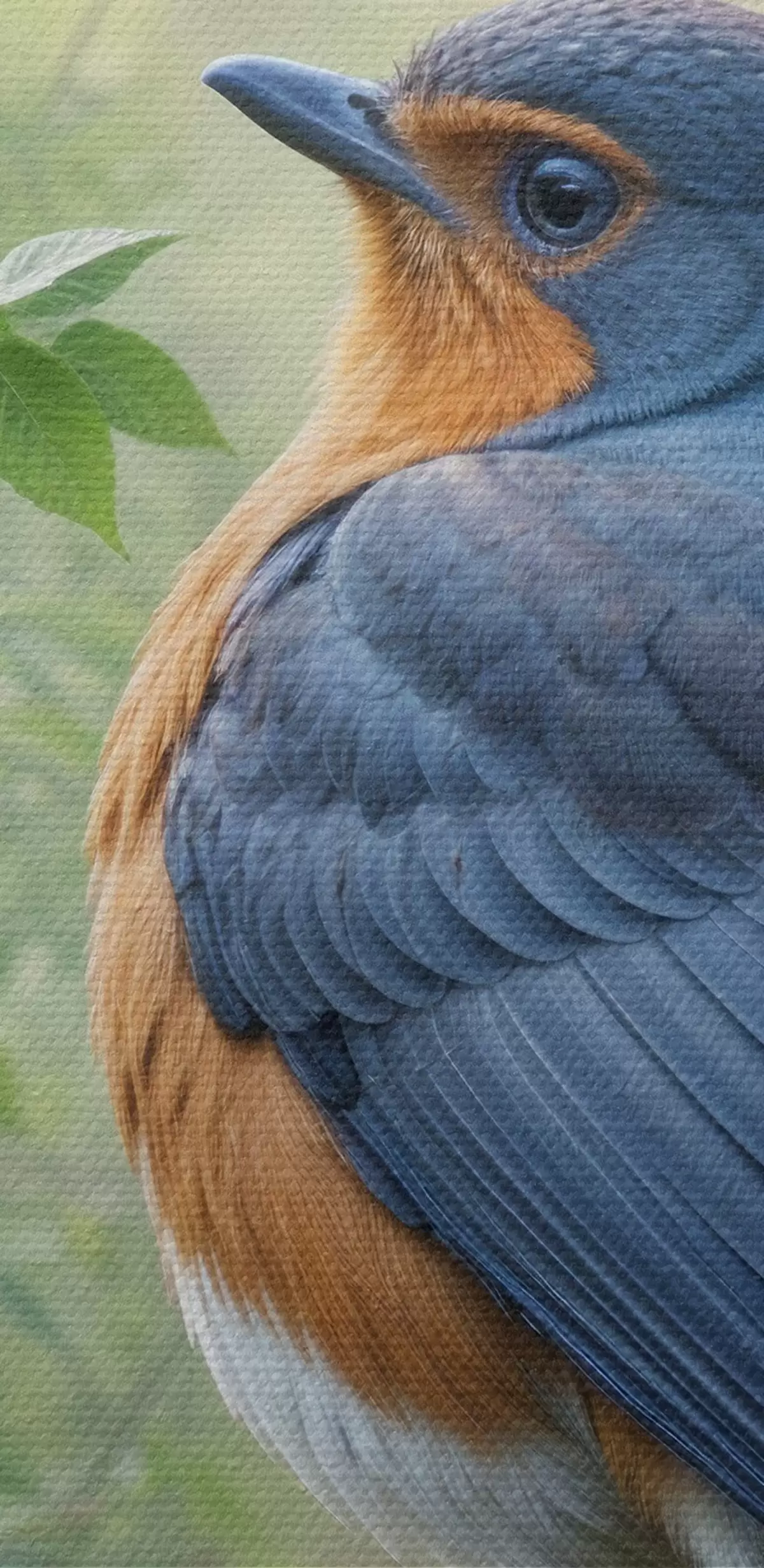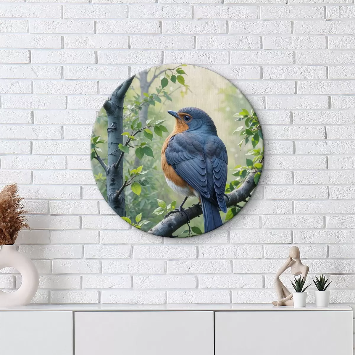Кругла картина Два синьо-помаранчеві птахи сиділи на гілці дерева із зеленим листям на задньому плані Nr r40156