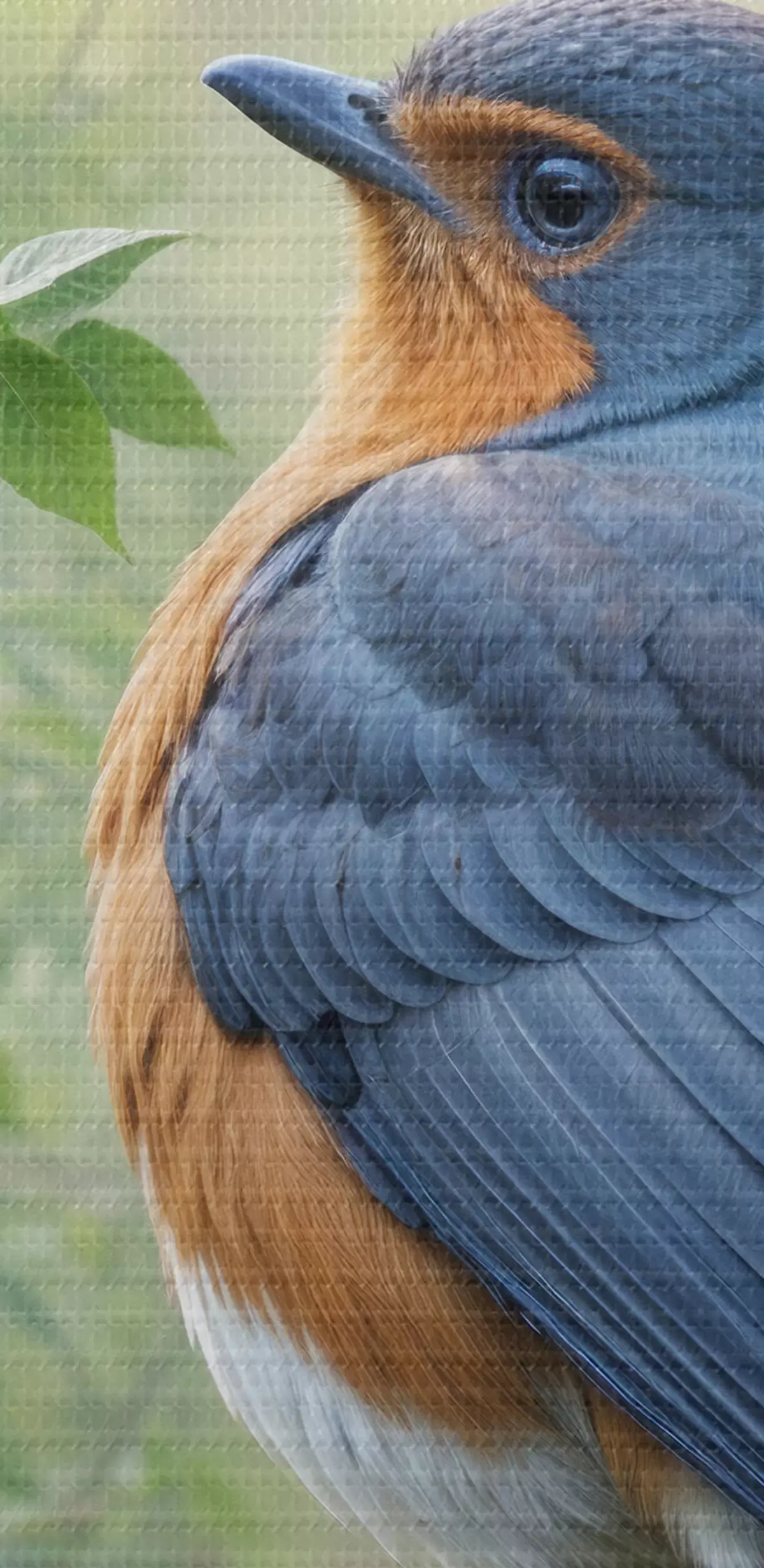 Кругла картина Два синьо-помаранчеві птахи сиділи на гілці дерева із зеленим листям на задньому плані r40156