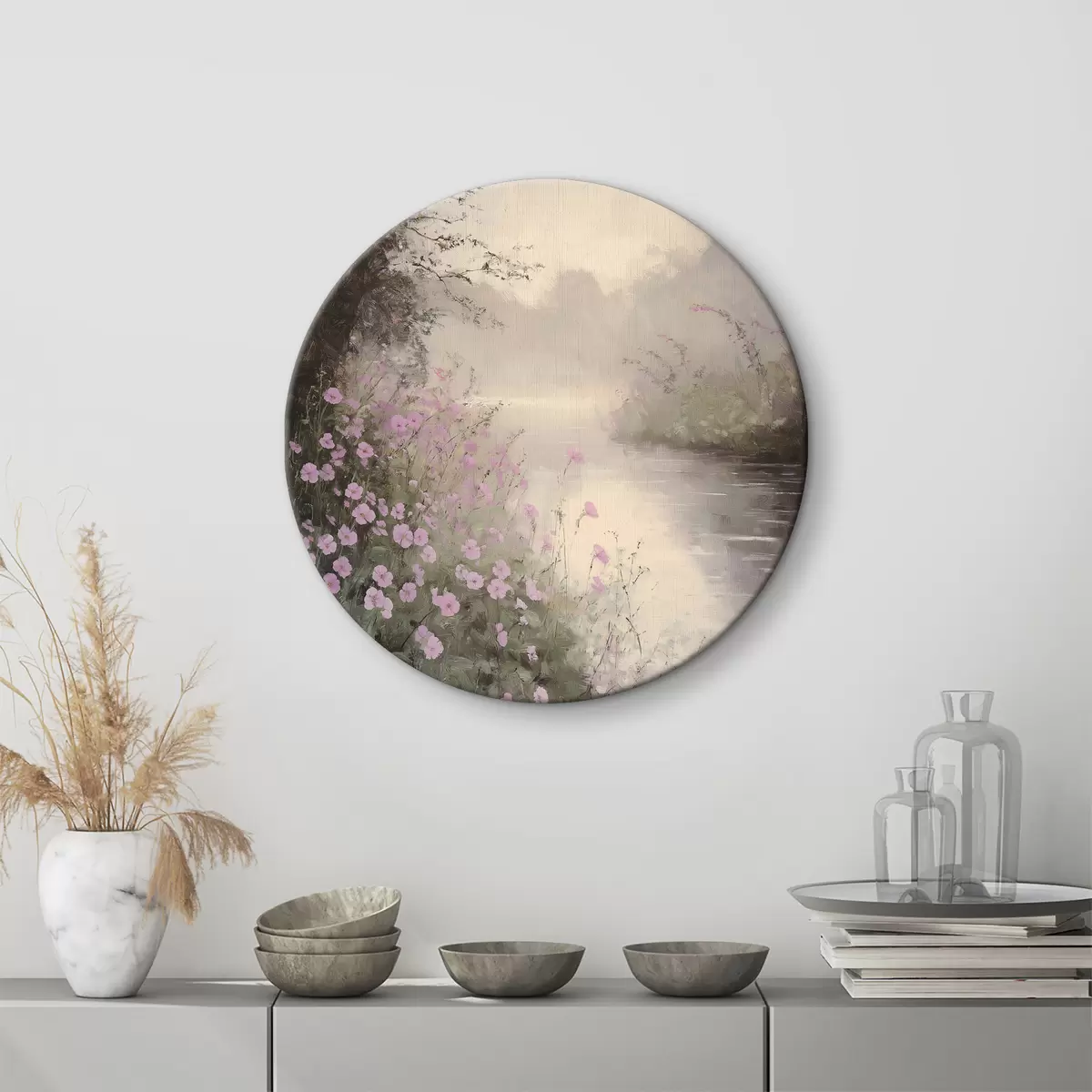 Кругла картина Озеро з рожевими квітами, схід сонця, олійний малюнок, пастельні бежеві кольори, туман Nr r40229