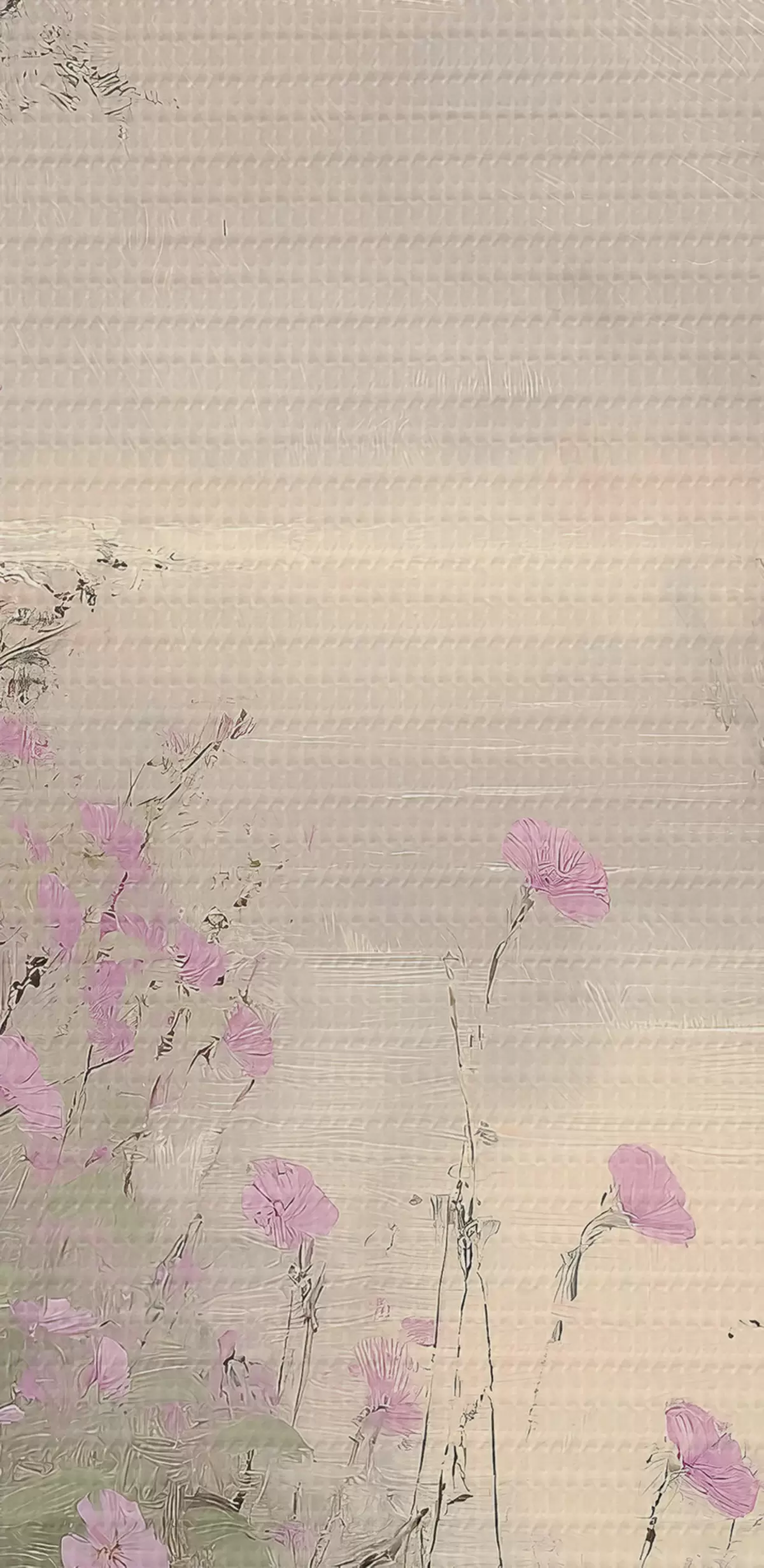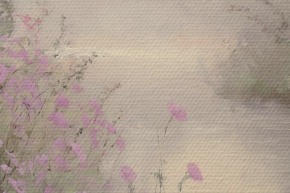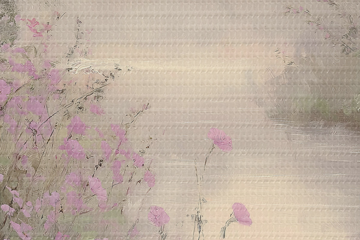 Кругла картина Озеро з рожевими квітами, схід сонця, олійний малюнок, пастельні бежеві кольори, туман r40229