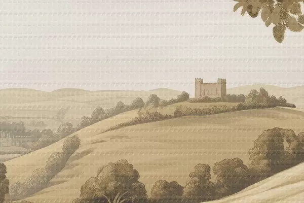Кругла картина Пейзаж природи в палітрі бежевого кольору, луг, квіти, дерева, замок Nr r40230