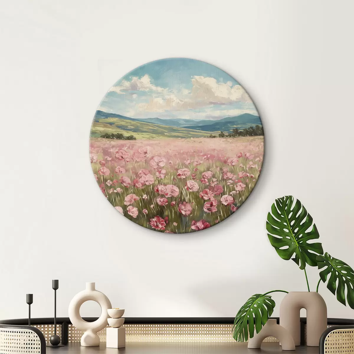 Кругла картина Луг з рожевими квітами, гори, природний краєвид, блакитне небо з хмарами, акрил Nr r40232