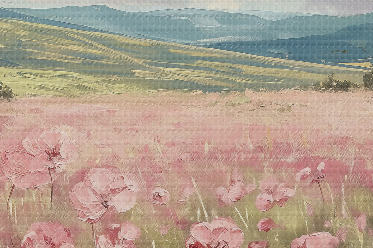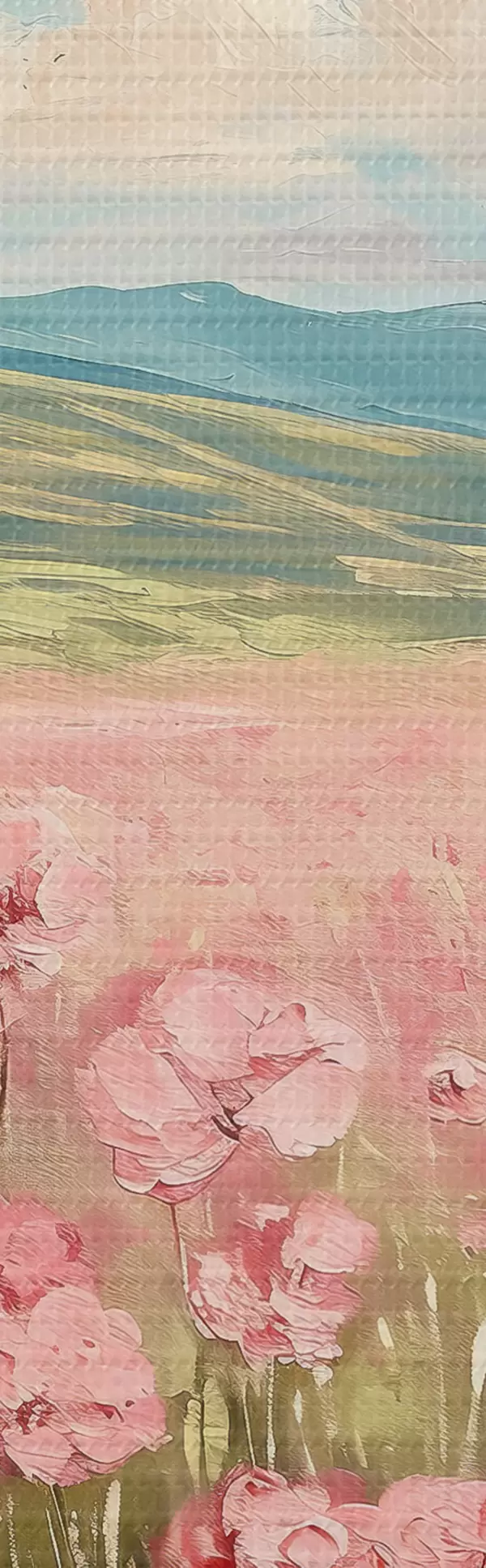 Кругла картина Луг з рожевими квітами, гори, природний краєвид, блакитне небо з хмарами, акрил r40232