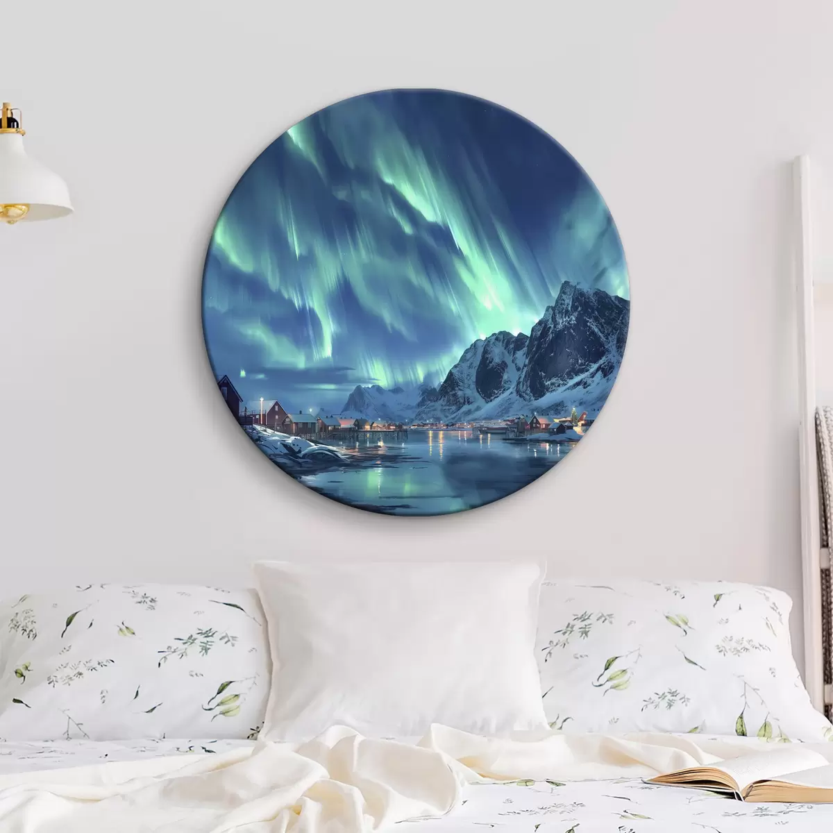 Кругла картина Норвегія зимове село, північне сяйво, нічне небо Nr r40300