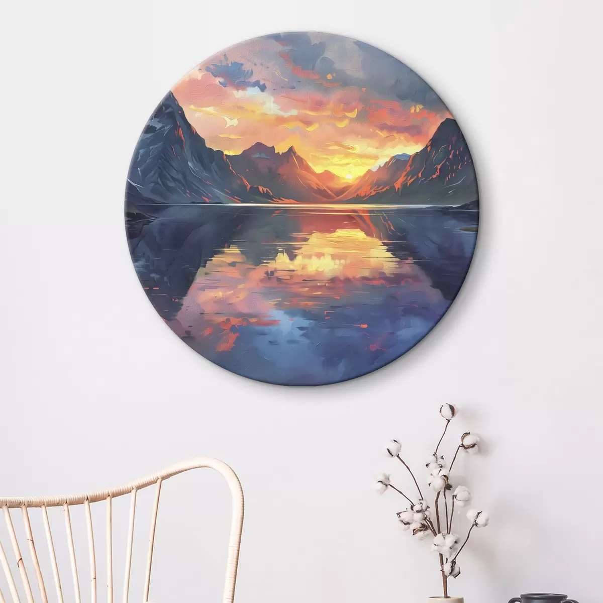 Кругла картина Захід сонця в горах, річка, природні пейзажі, акрилові фарби Nr r40306