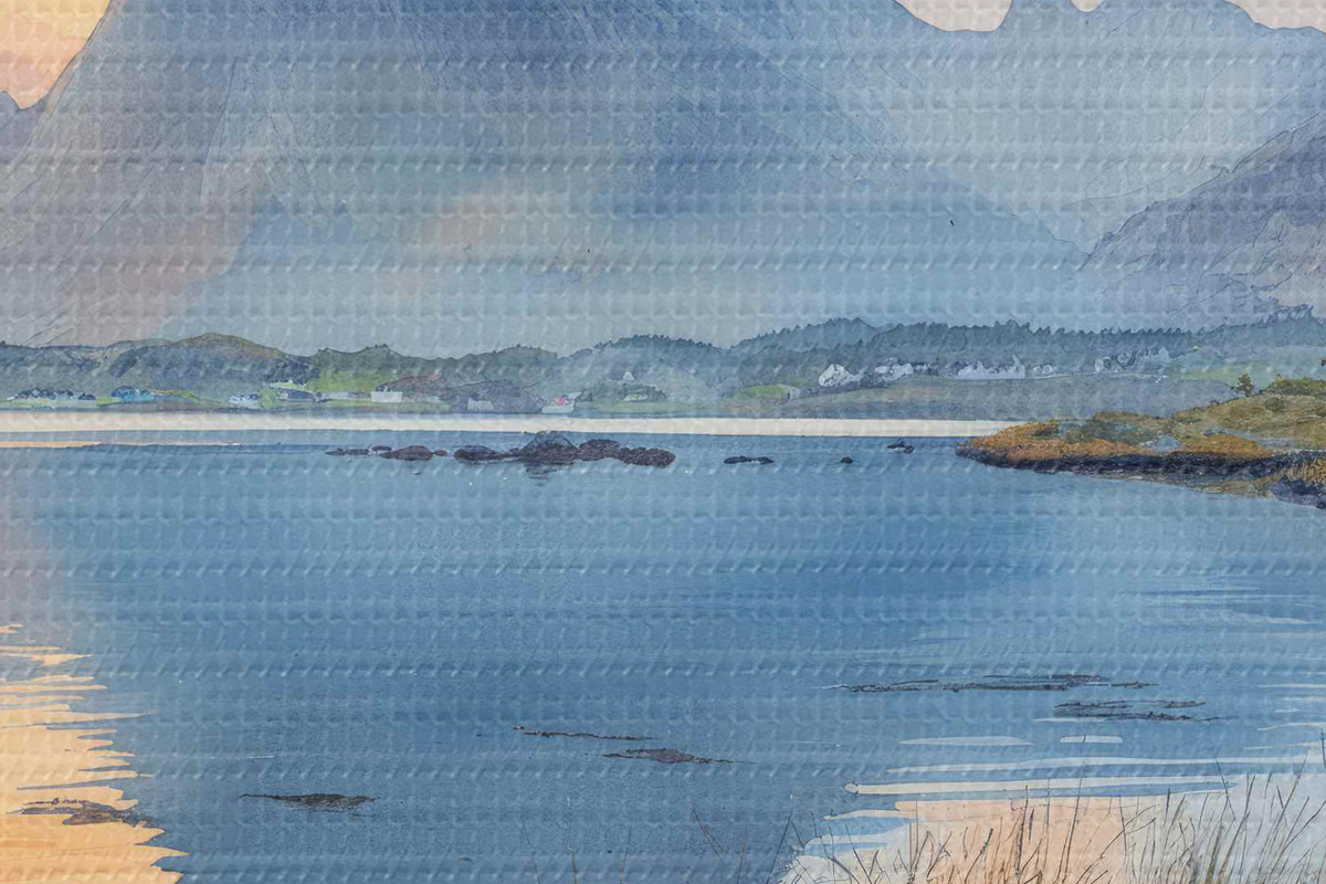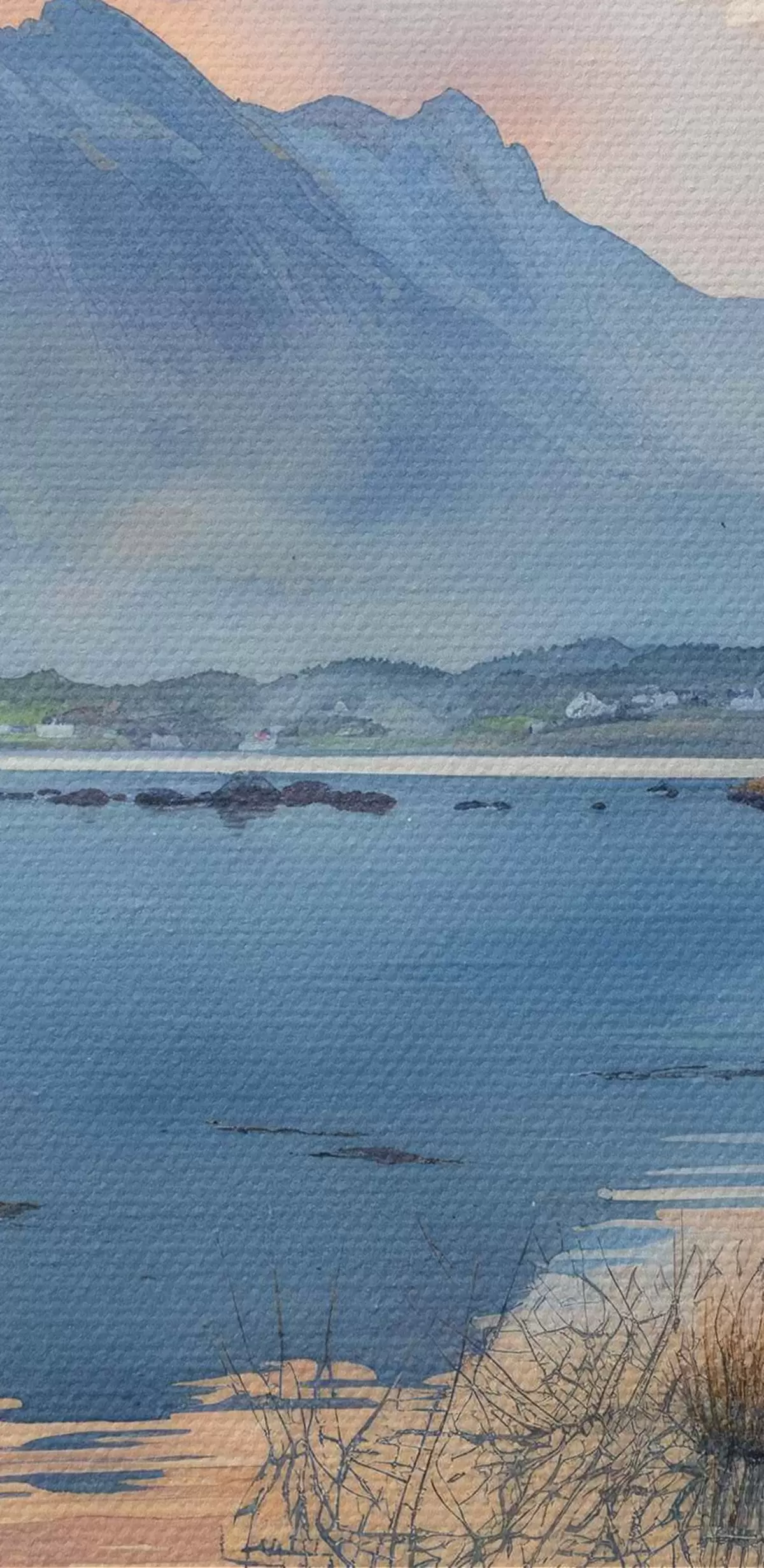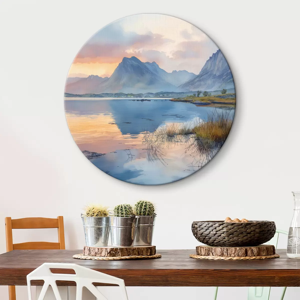 Кругла картина Спокійна річка з горами, схід сонця, м'які кольори Nr r40307