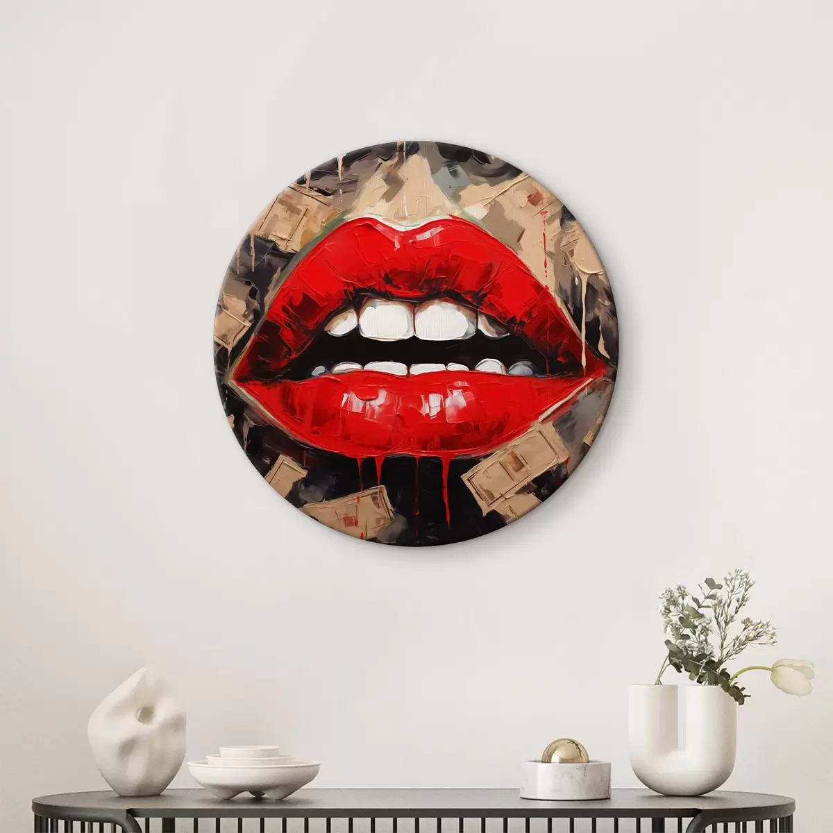 Кругла картина Абстрактний малюнок червоні губи білі зуби Nr r40319