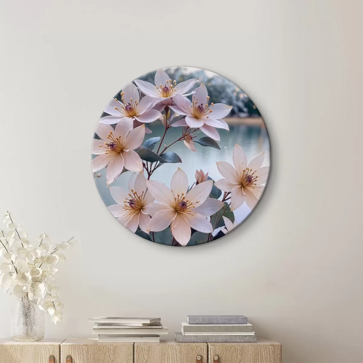 Кругла картина Ніжні рожеві квіти лотоса плавають на спокійній воді з розмитим фоном дерев і листя Nr r40388