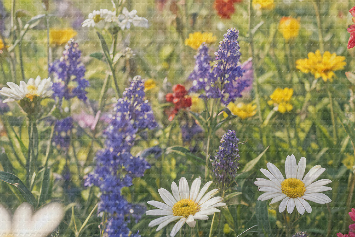 Кругла картина Барвистий луг з польовими квітами з різними квітами, включаючи ромашки, лаванду та червоні квіти r40390