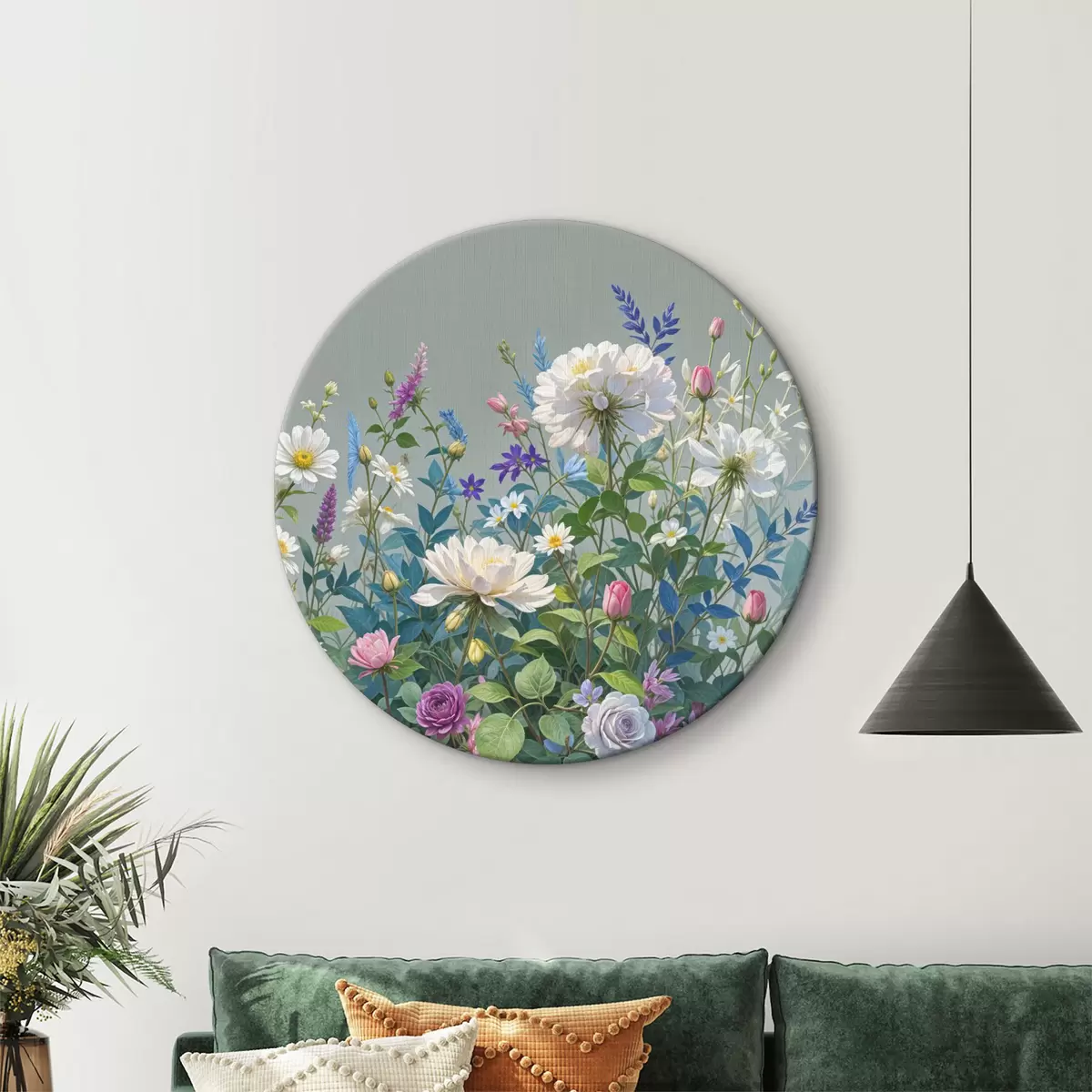 Кругла картина Пишний, яскравий сад, наповнений різними барвистими квітами та квітучими рослинами на сірому фоні Nr r40393