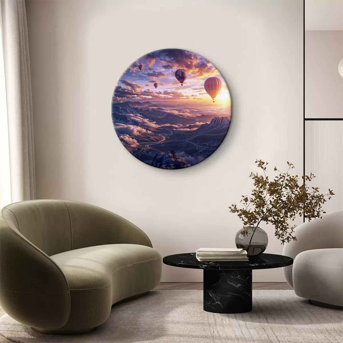 Кругла картина Повітряні кулі ширяють над гірським ландшафтом на заході сонця, з хмарами та яскравими кольорами в небі Nr r40397