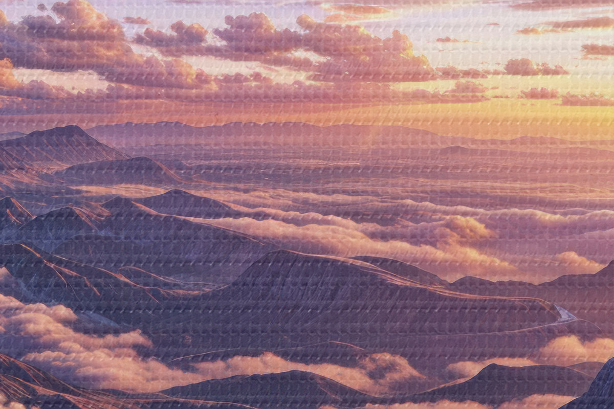 Кругла картина Повітряні кулі ширяють над гірським ландшафтом на заході сонця, з хмарами та яскравими кольорами в небі r40397