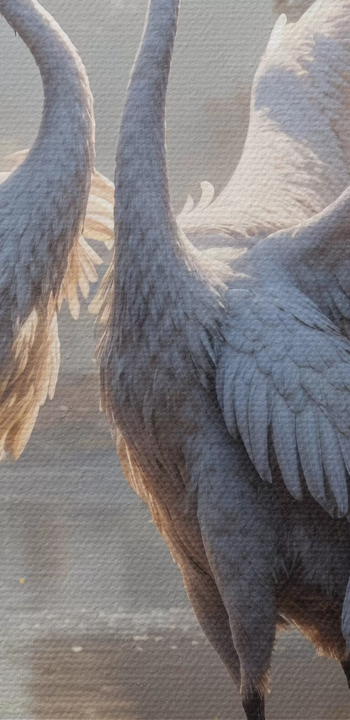 Кругла картина Два великих сірих журавля з довгими шиями та розпростертими крилами стоять у туманному озері в оточенні дерев Nr r40404