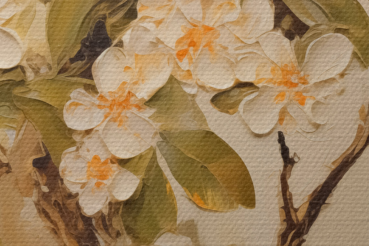 Кругла картина Гілка з білими квітами та апельсинами на сіро-бежевому фоні Nr r40486