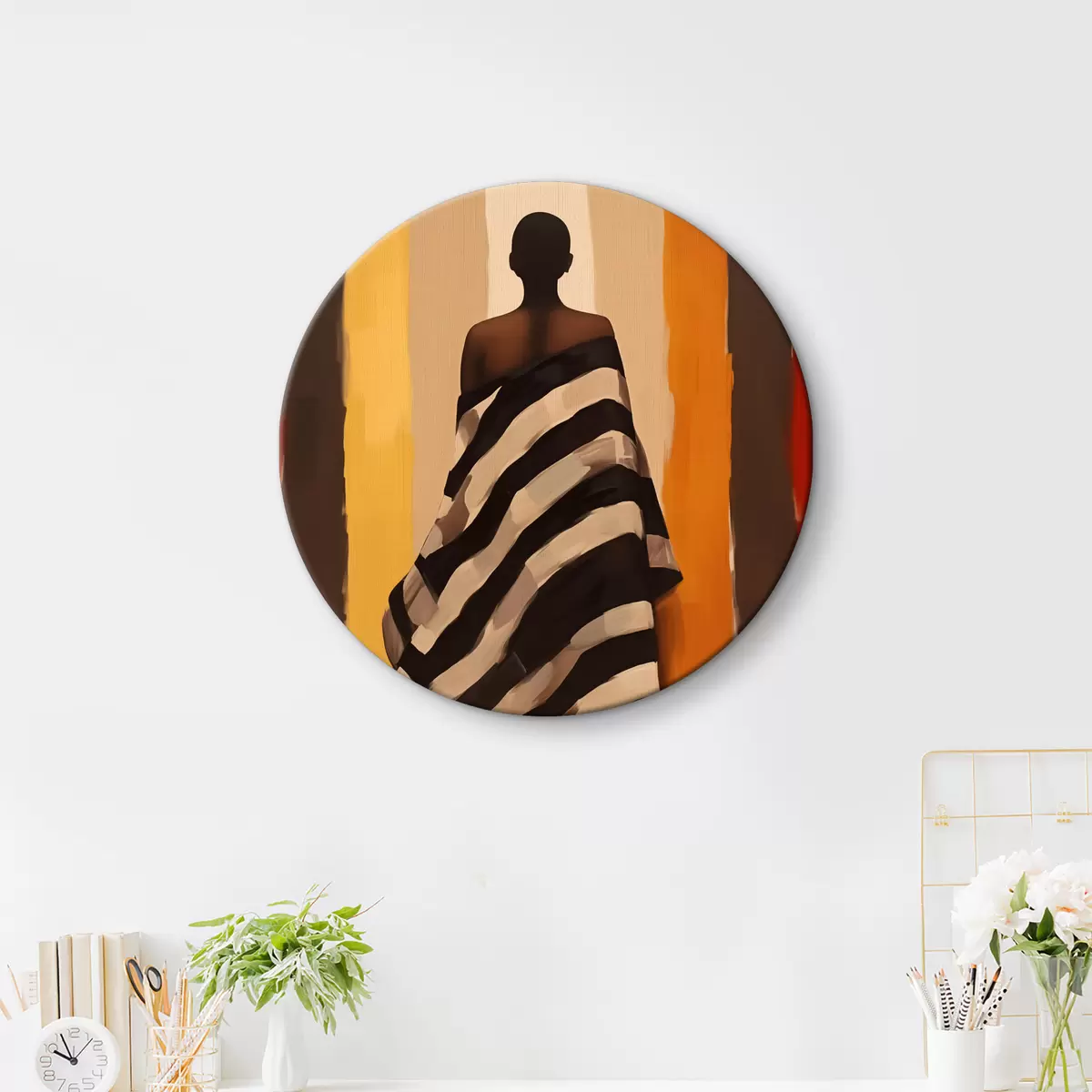 Кругла картина Силует афроамериканки в смугастій накидці на фоні з вертикальними смугами, чорний, бежевий, жовтий, червоний, коричневий Nr r40487