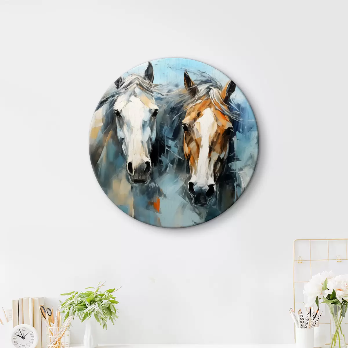 Кругла картина Коні абстрактний живопис білий, блакитний, коричневий колір r40493
