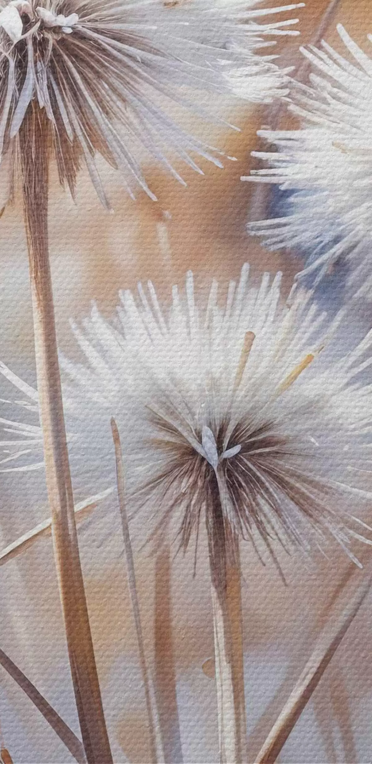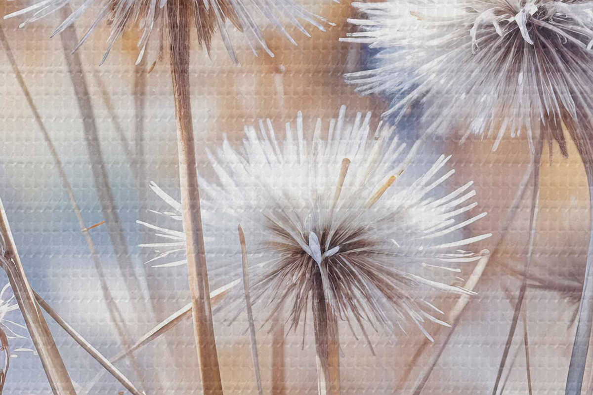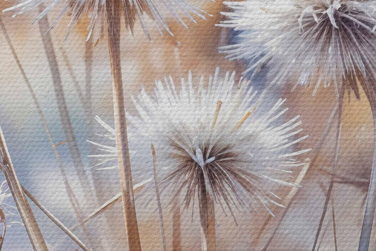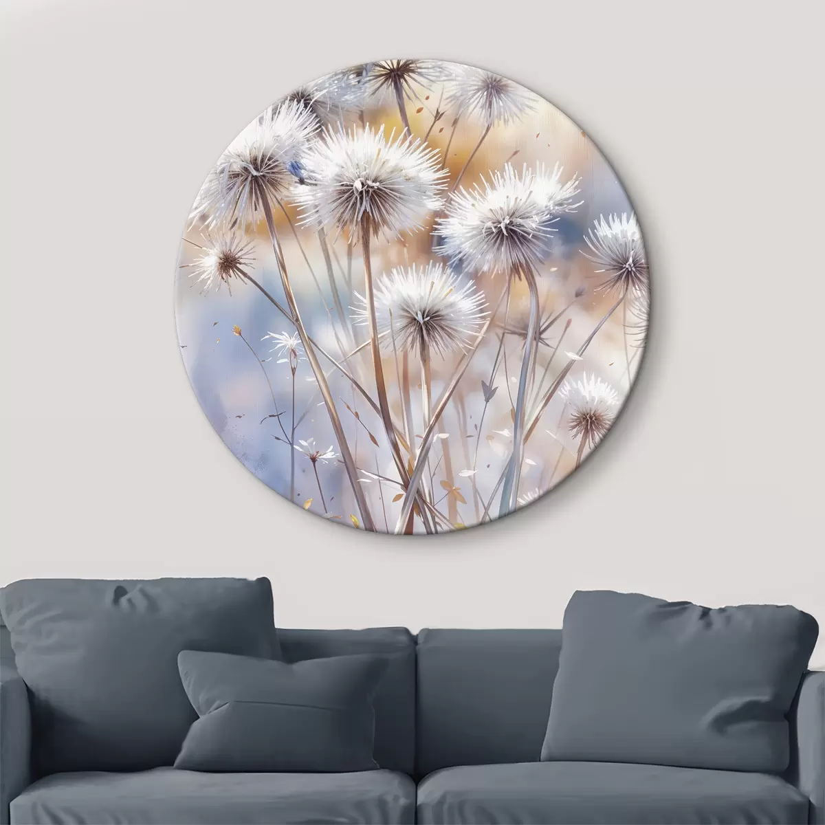 Кругла картина Пухнасті білі квіти кульбаби на розмитому акварельному тлі з теплим освітленням Nr r40541