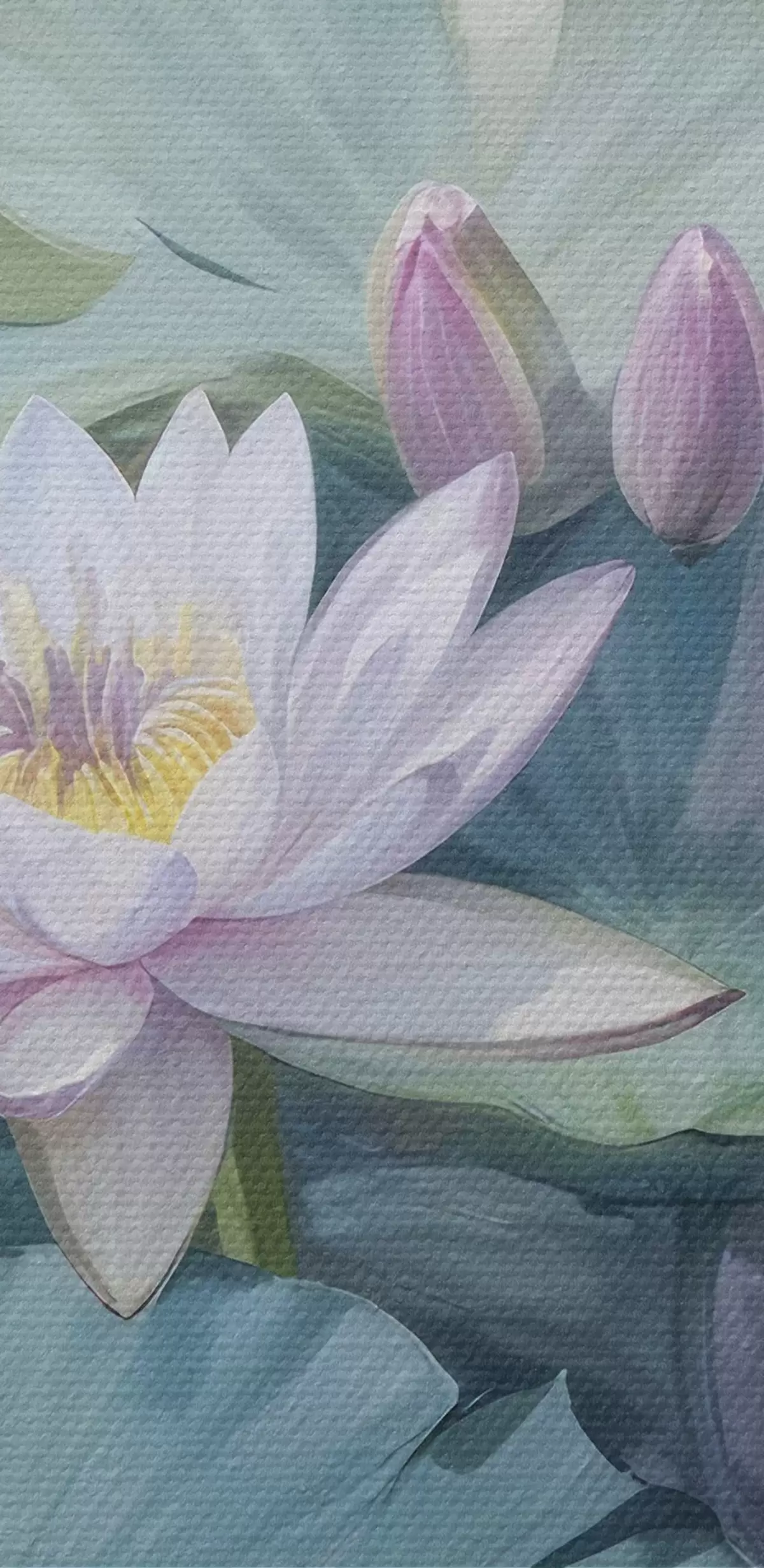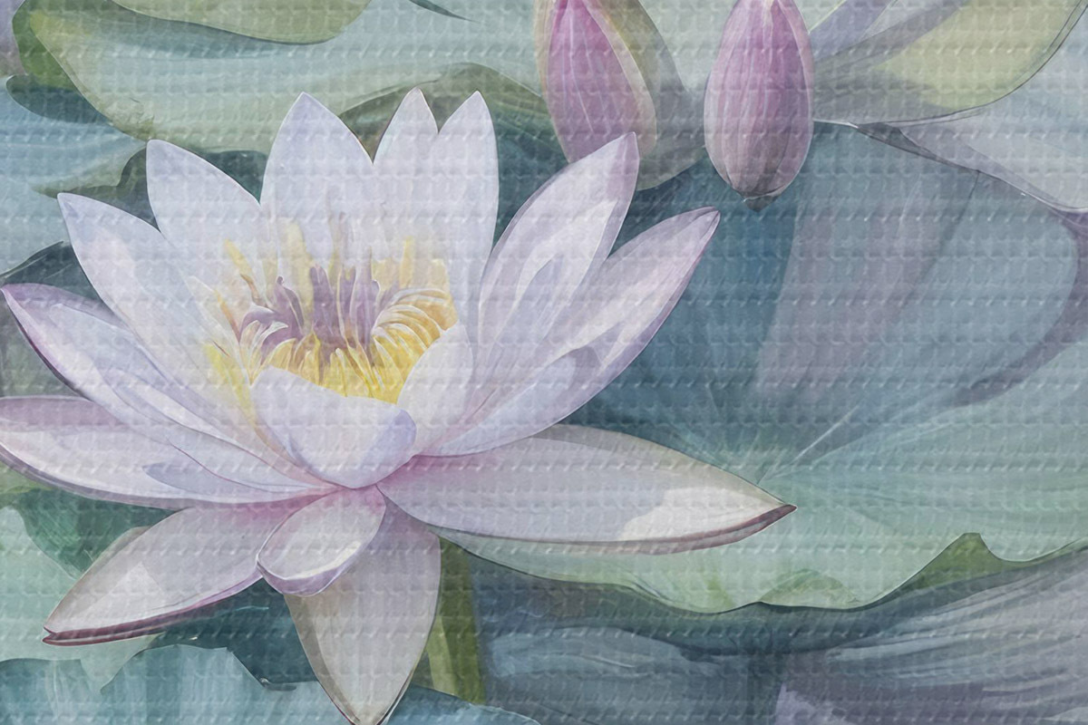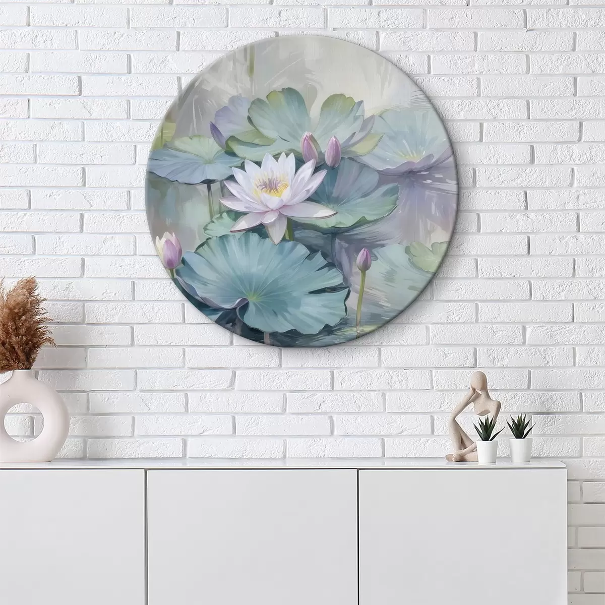 Кругла картина Спокійне зображення ставка з водяними ліліями та квітами в пастельних тонах, в оточенні пишного зеленого листя латаття r40542