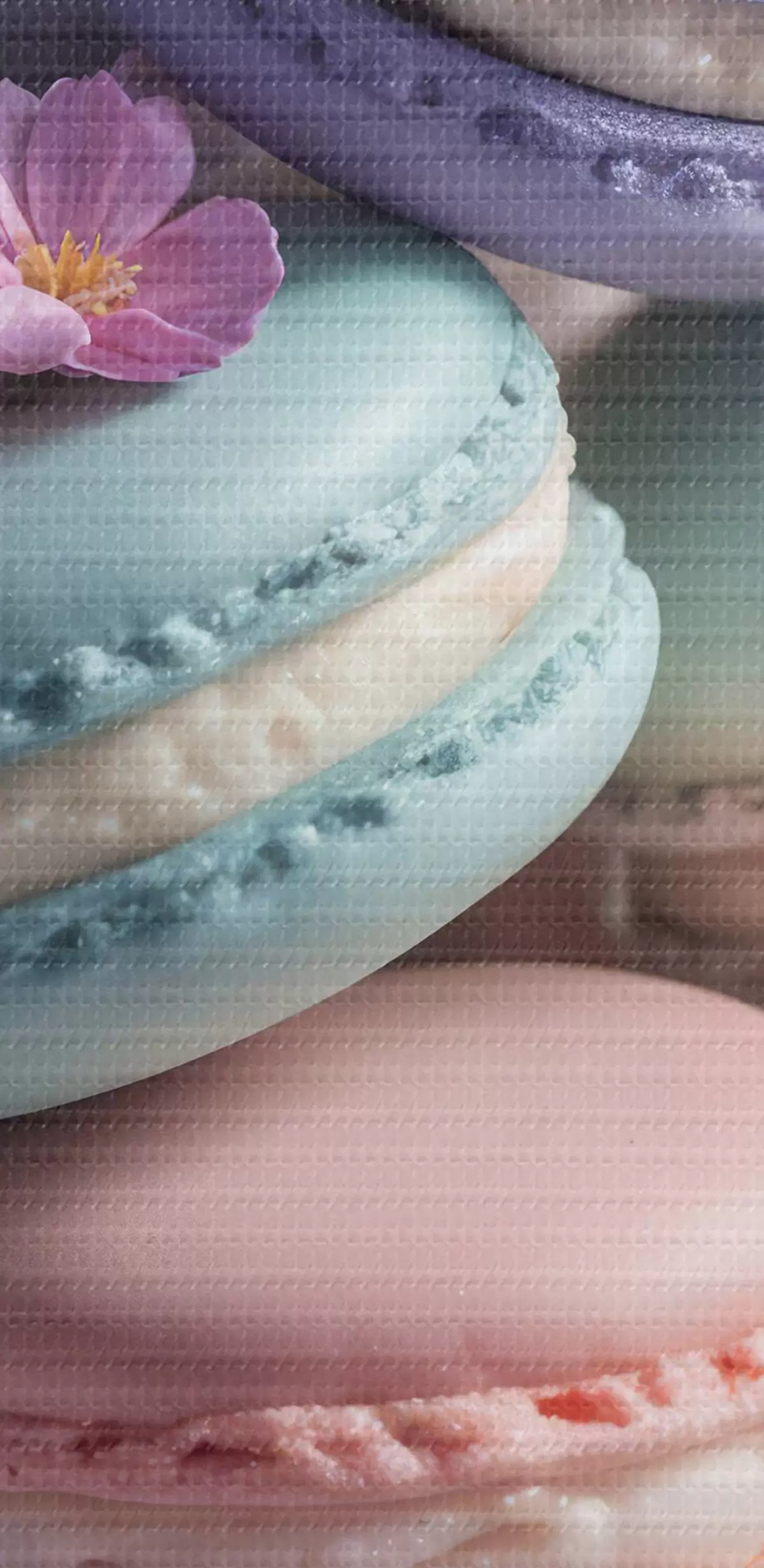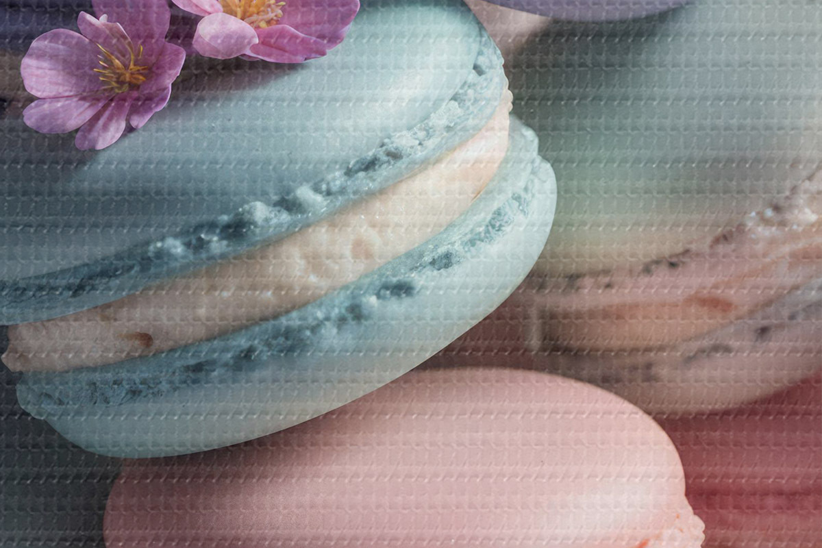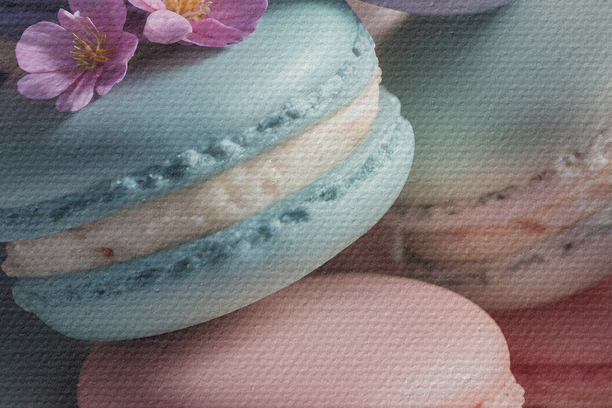 Кругла картина Різнокольорові макаруни з рожевими та фіолетовими квітами на тарілці, крупним планом r40546