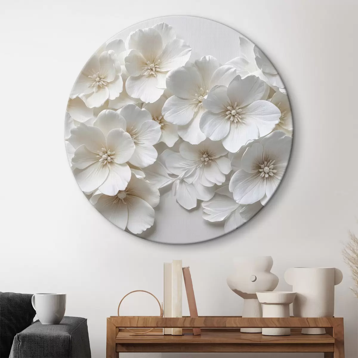 Кругла картина Білі квіти з ніжними пелюстками, розташованими в красивому квітковому візерунку на світлому тлі Nr r40548