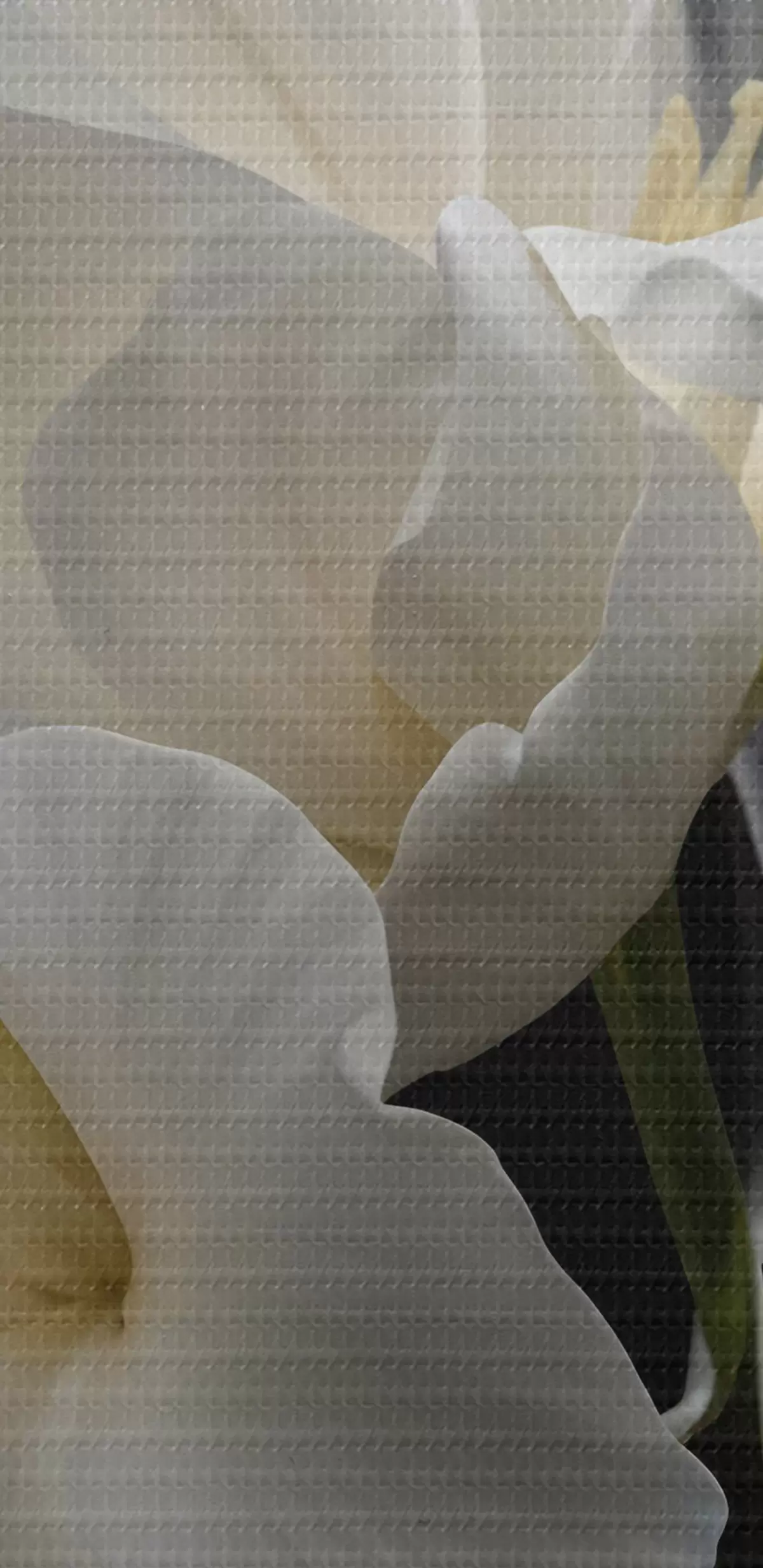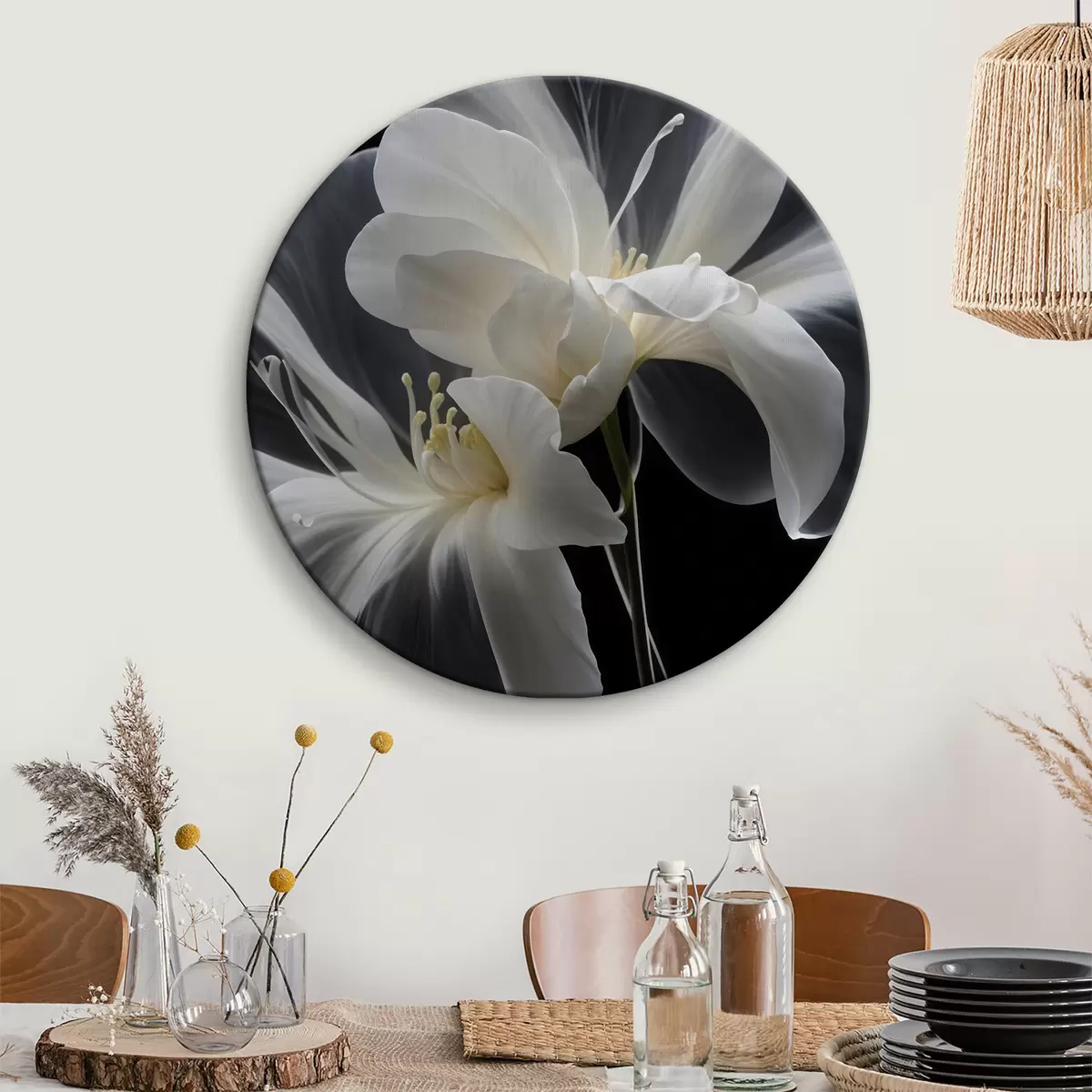 Кругла картина Крупним планом дві білі квітки з ніжними пелюстками і жовтими серединками на темному тлі Nr r40549