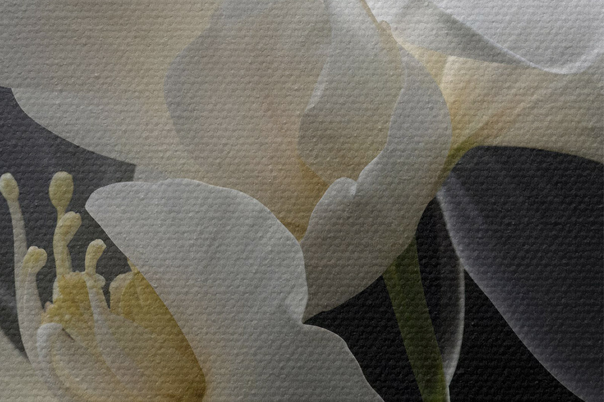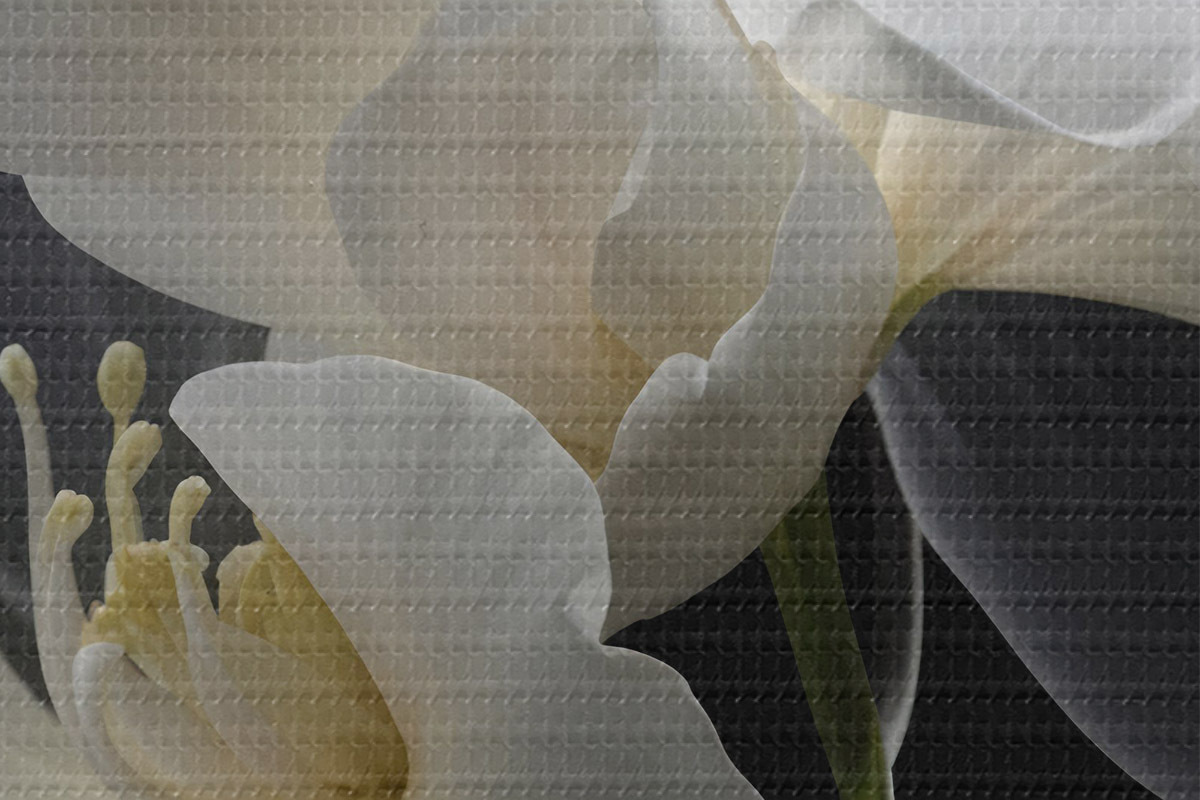 Кругла картина Крупним планом дві білі квітки з ніжними пелюстками і жовтими серединками на темному тлі r40549