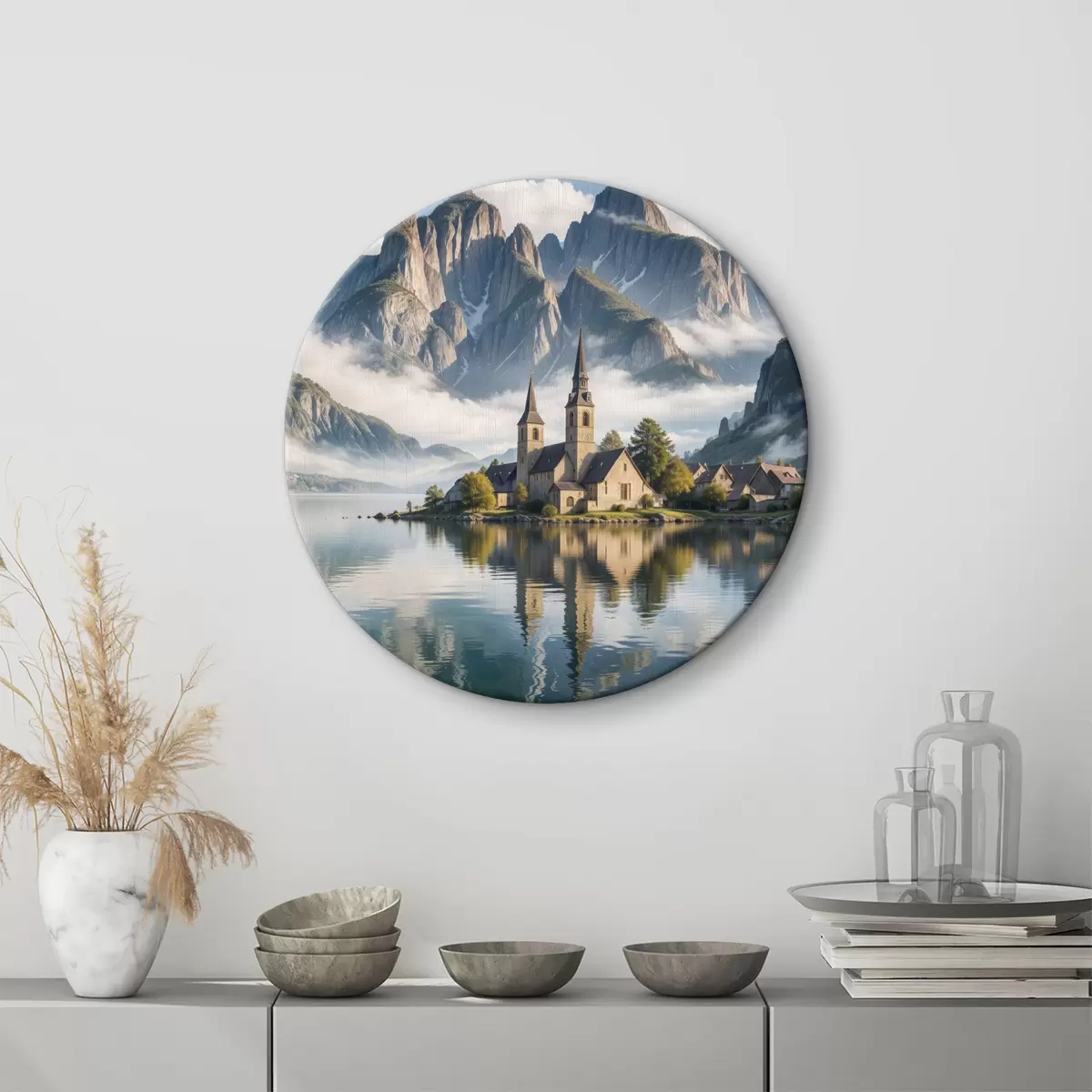 Кругла картина Мальовниче альпійське село, розташоване на березі тихого озера, над яким височіють засніжені гори Nr r40554