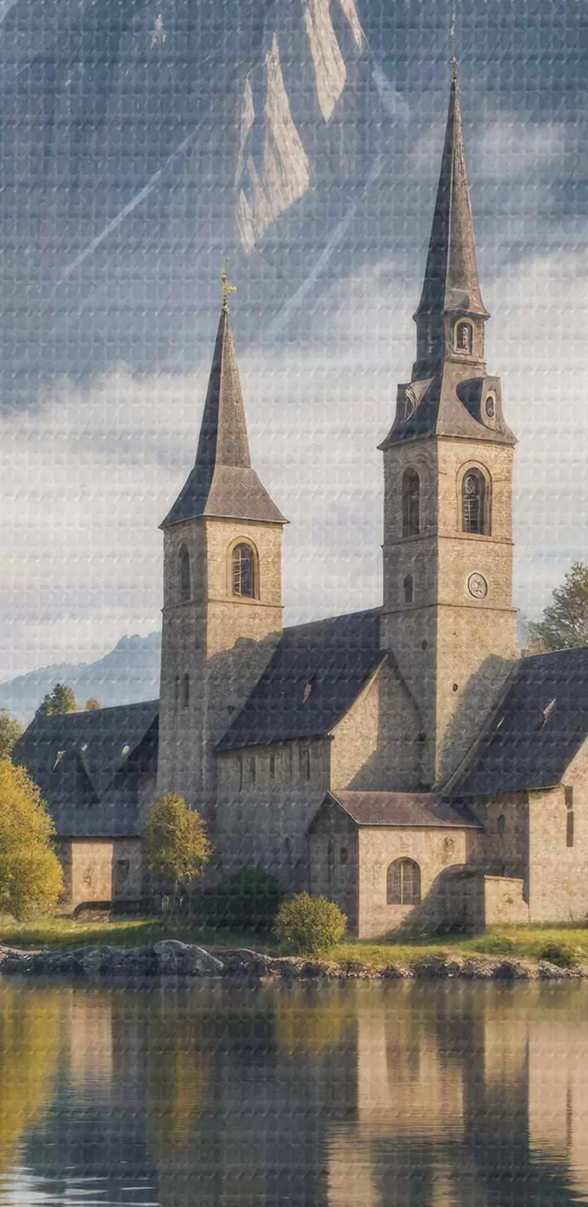 Кругла картина Мальовниче альпійське село, розташоване на березі тихого озера, над яким височіють засніжені гори r40554