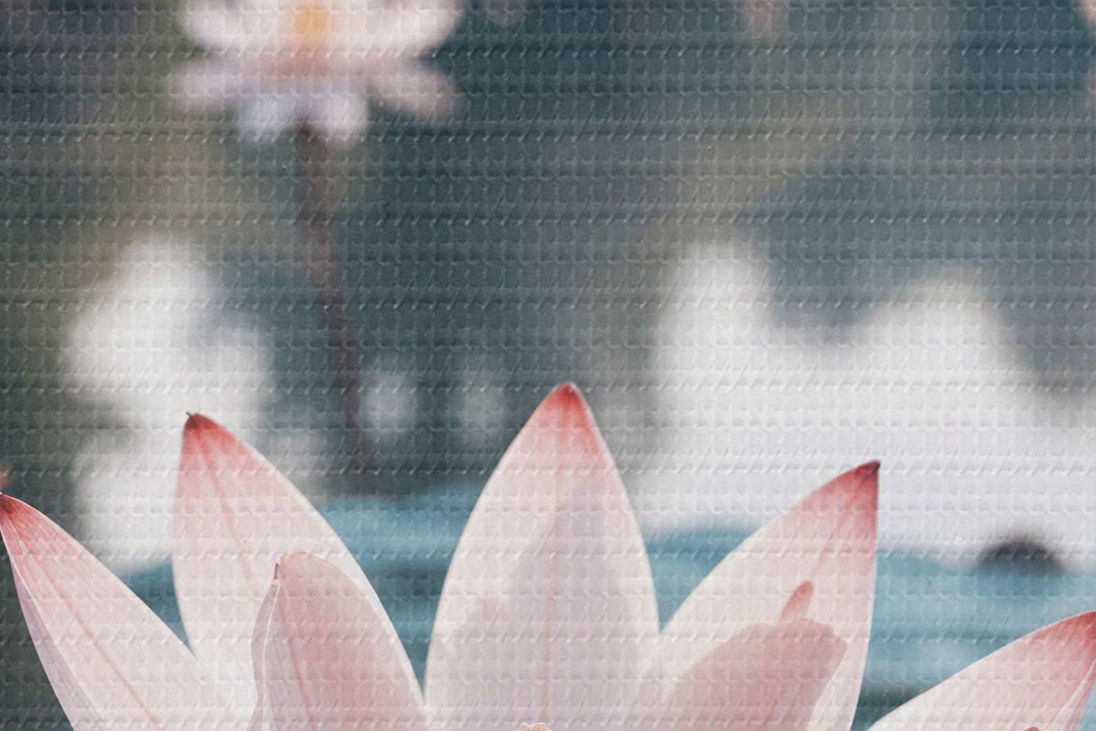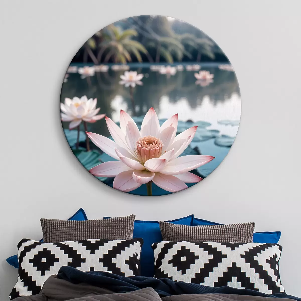 Кругла картина Ставок із рожевими квітами лотоса, що плавають на поверхні, оточений пишною зеленню та пальмами Nr r40555