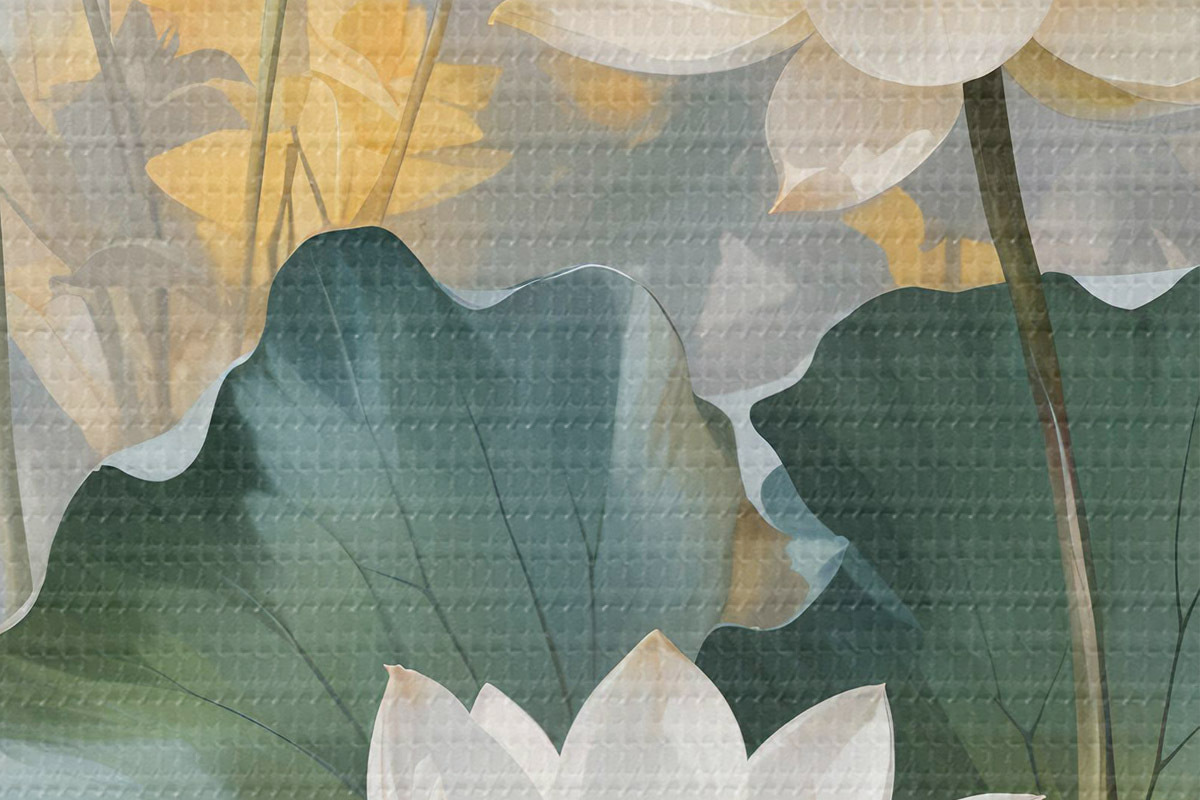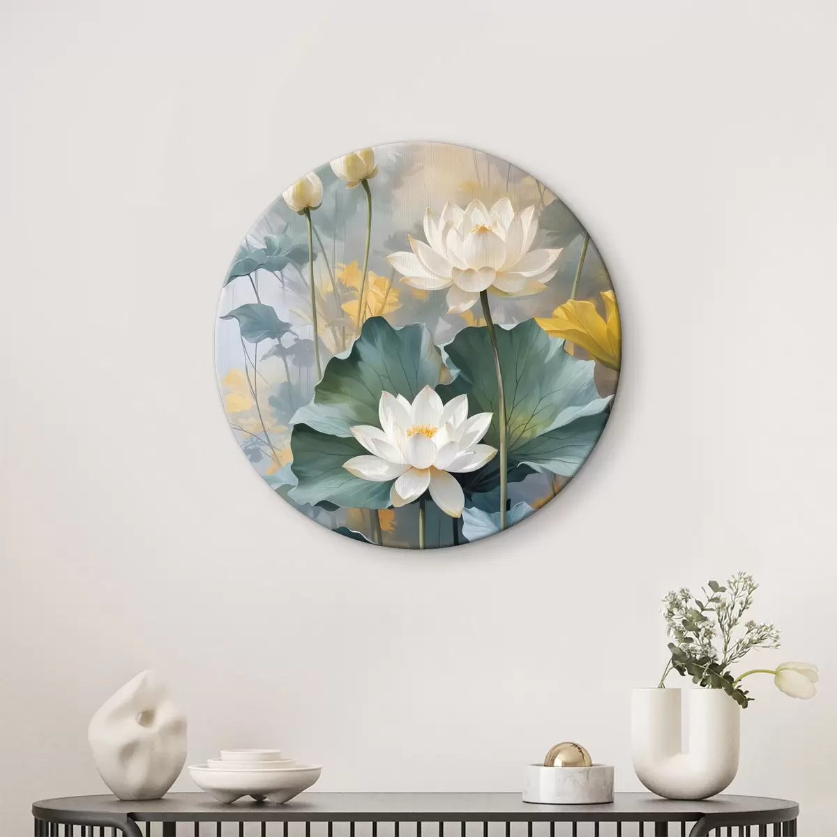 Кругла картина Білі квіти лотоса у ставку з зеленими пелюстками латаття, оточені жовтими квітами та розмитим тлом r40559