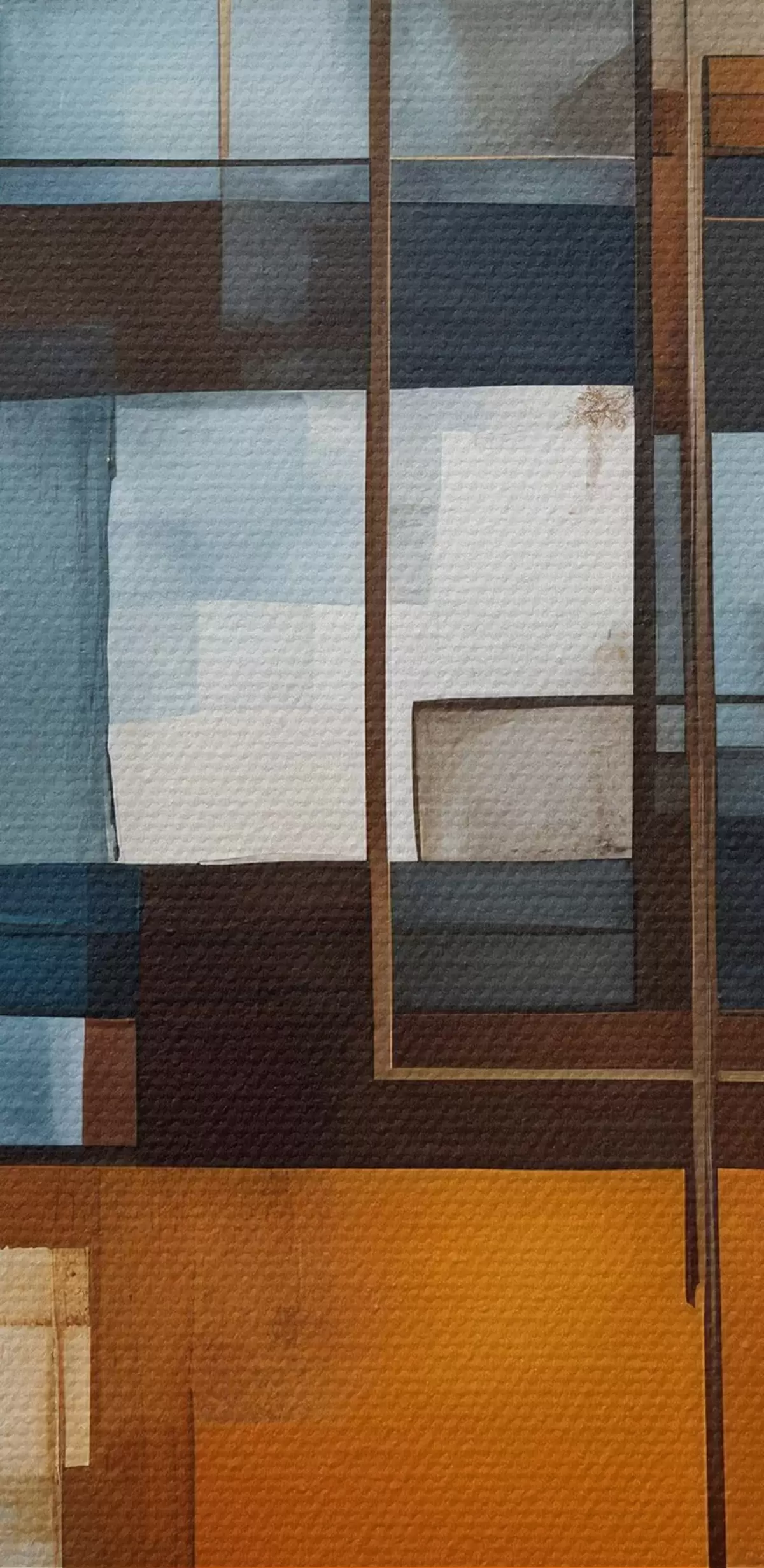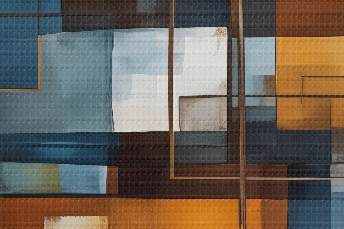 Кругла картина Абстрактні геометричні фігури у відтінках синього, помаранчевого та коричневого створюють сучасну, мінімалістичну композицію. Nr r40563