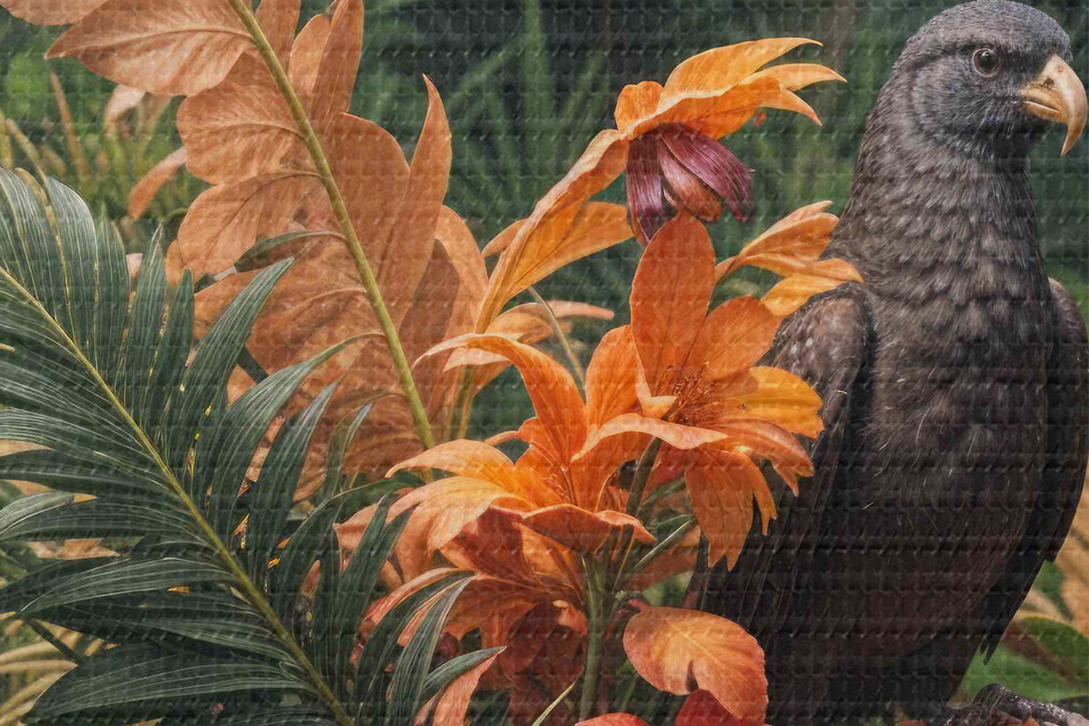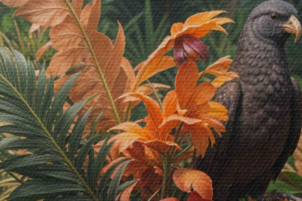 Кругла картина Тропічний птах сидить на гілці в оточенні пишної рослинності, пальмового листя, квітів та екзотичних рослин Nr r40578