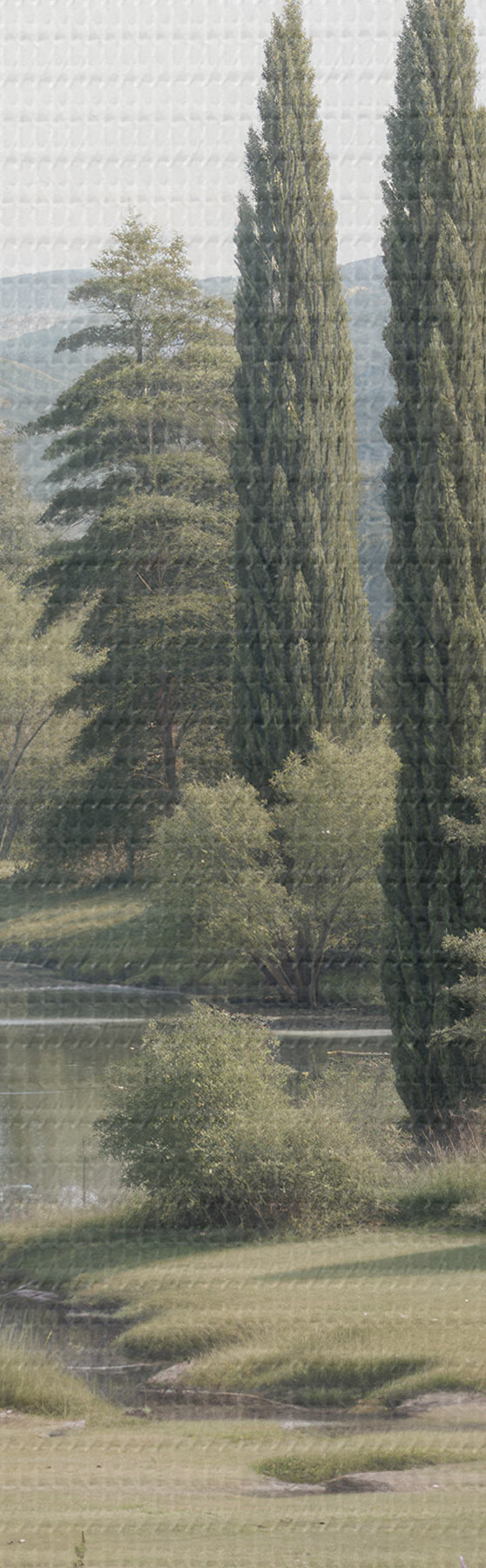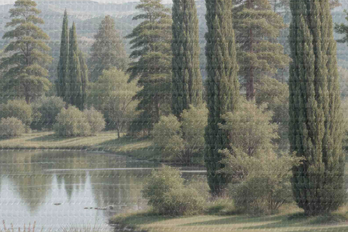 Кругла картина Спокійний пейзаж з тихим озером, оточеним соснами, кипарисами та іншою пишною рослинністю Nr r40579