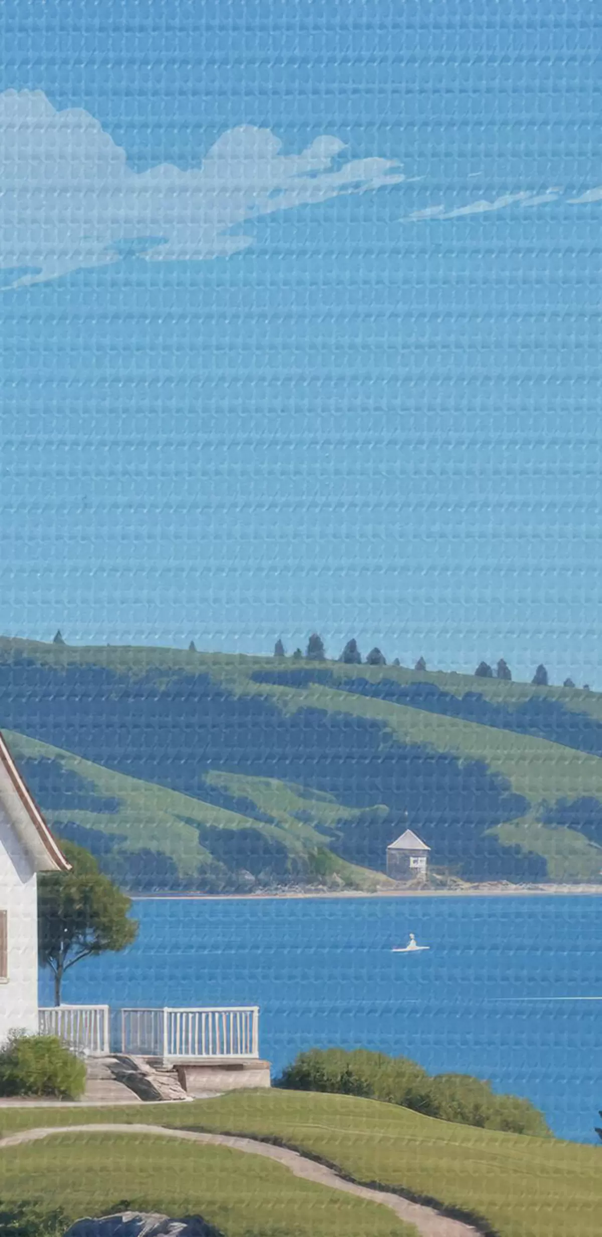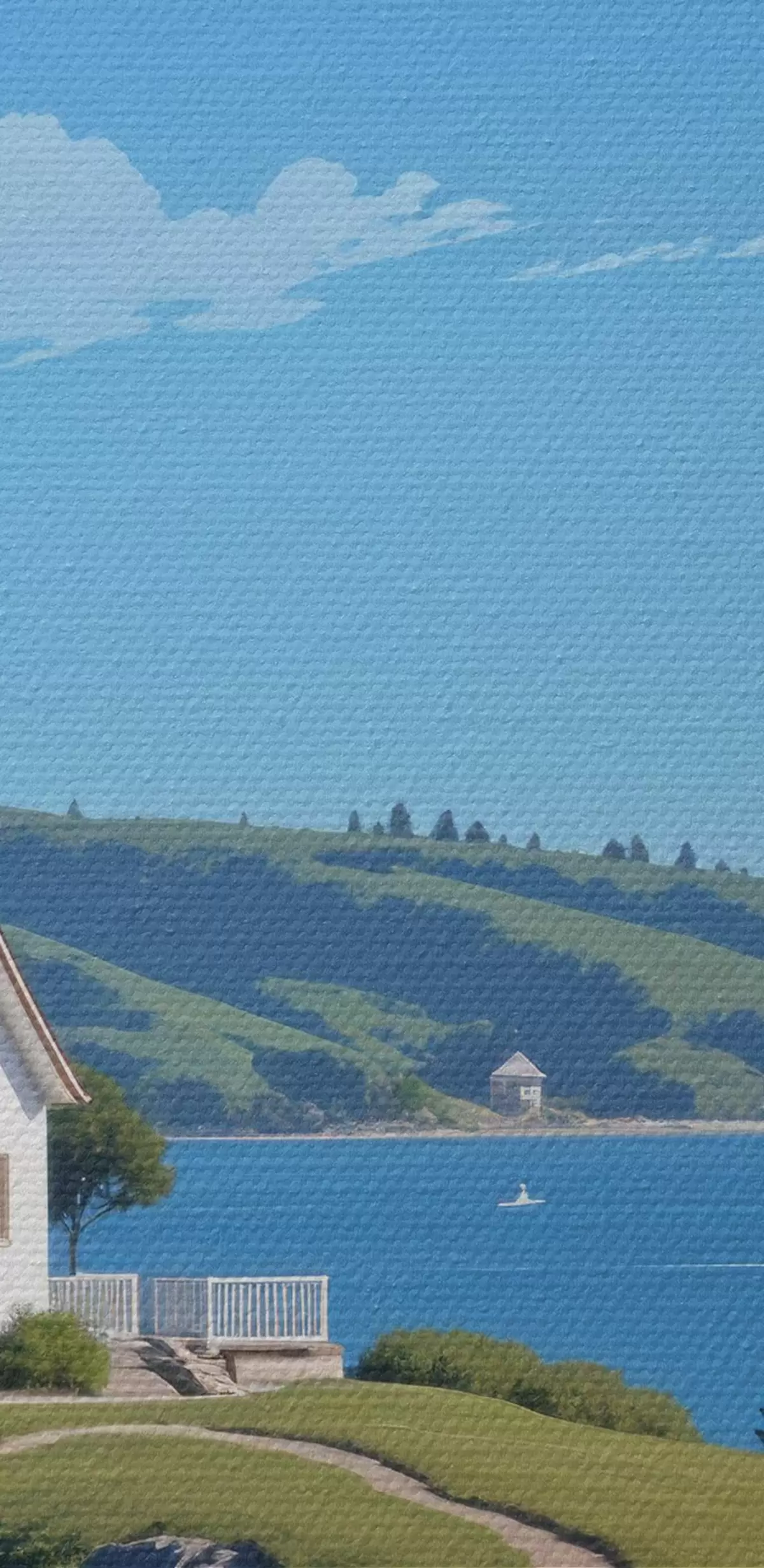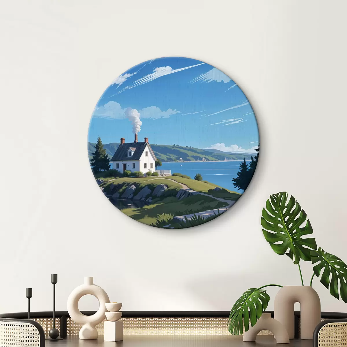 Кругла картина Білий будинок на трав'янистому пагорбі з горами на задньому плані і блакитним небом з пухкими хмарами Nr r40587