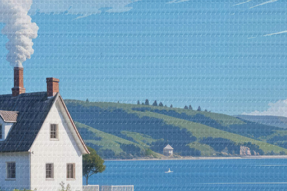 Кругла картина Білий будинок на трав'янистому пагорбі з горами на задньому плані і блакитним небом з пухкими хмарами r40587