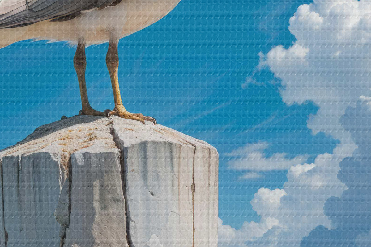 Кругла картина Біла чайка, що сидить на дерев'яному стовпі на тлі блакитного неба та океану з хвилями r40590