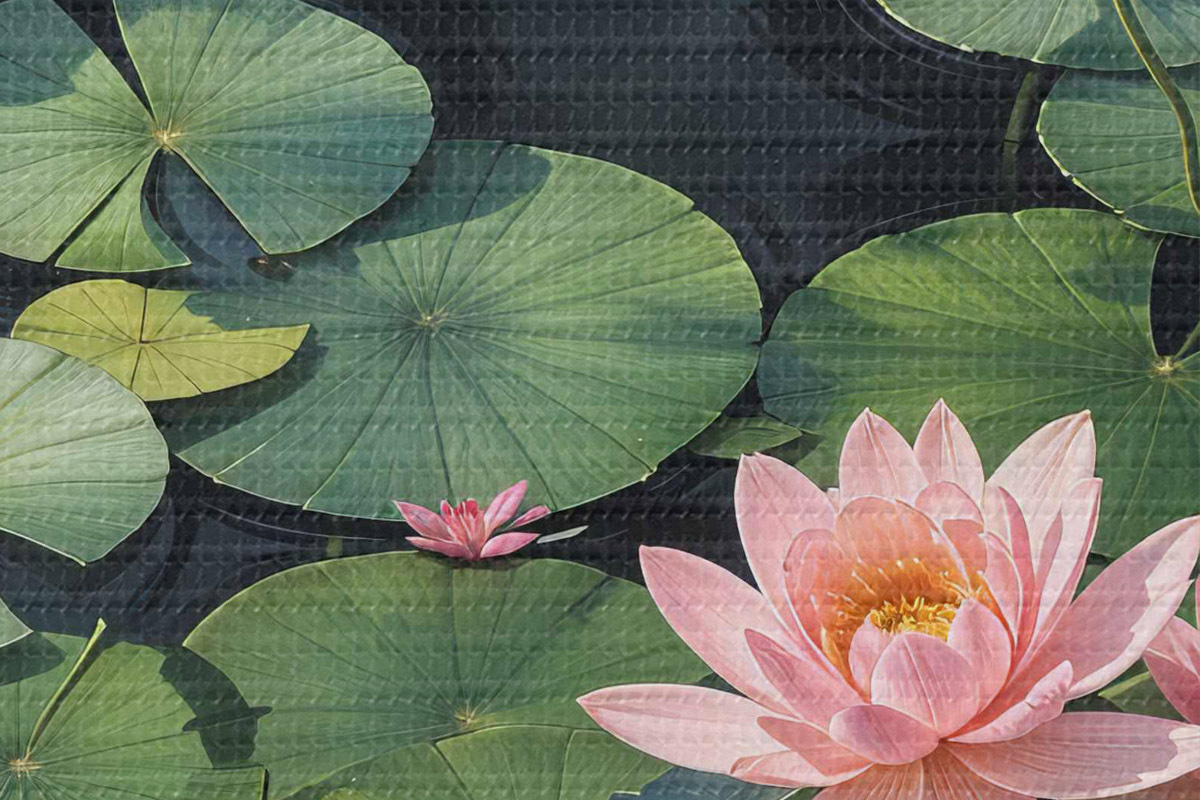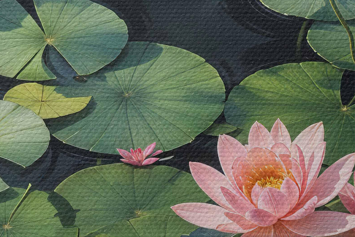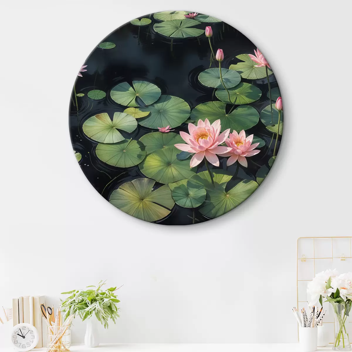 Кругла картина Ставок з рожевими водяними ліліями та зеленими пелюстками лілій, що плавають на поверхні, в оточенні темного фону Nr r40598