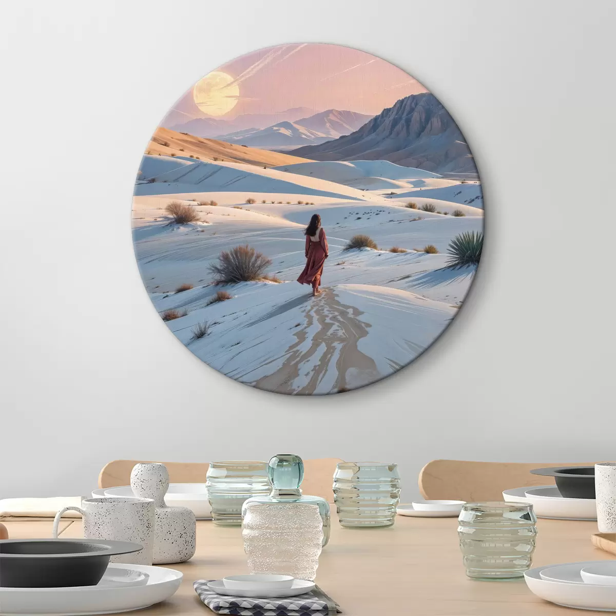Кругла картина Жінка в червоній сукні на тлі пустельного пейзажу з горою на задньому плані та дюнами Nr r40603