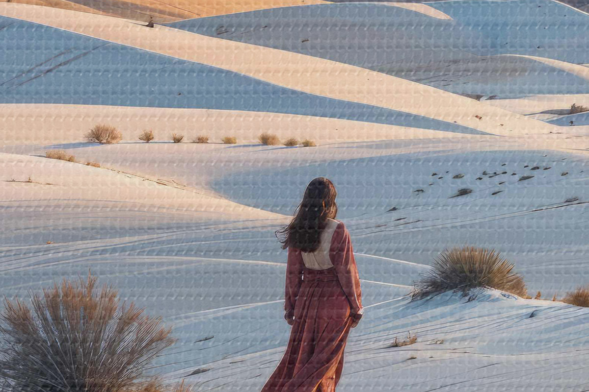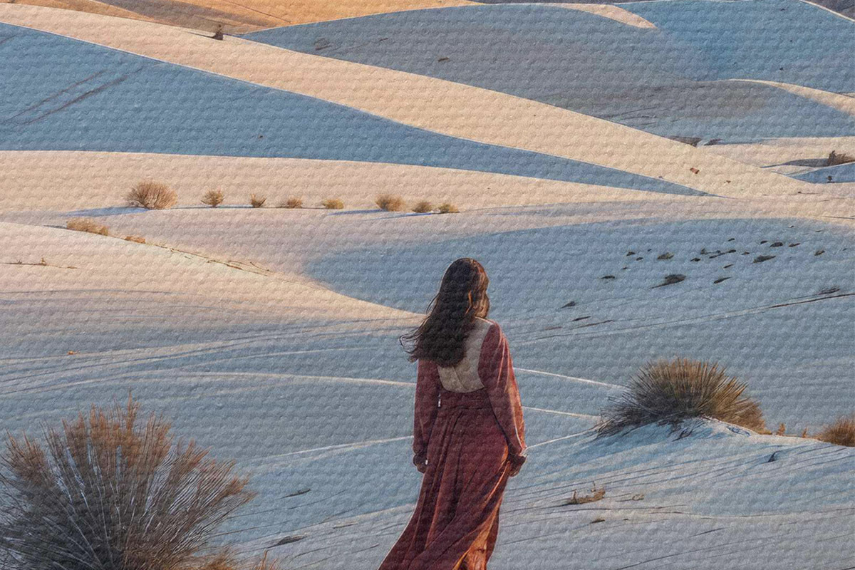 Кругла картина Жінка в червоній сукні на тлі пустельного пейзажу з горою на задньому плані та дюнами r40603
