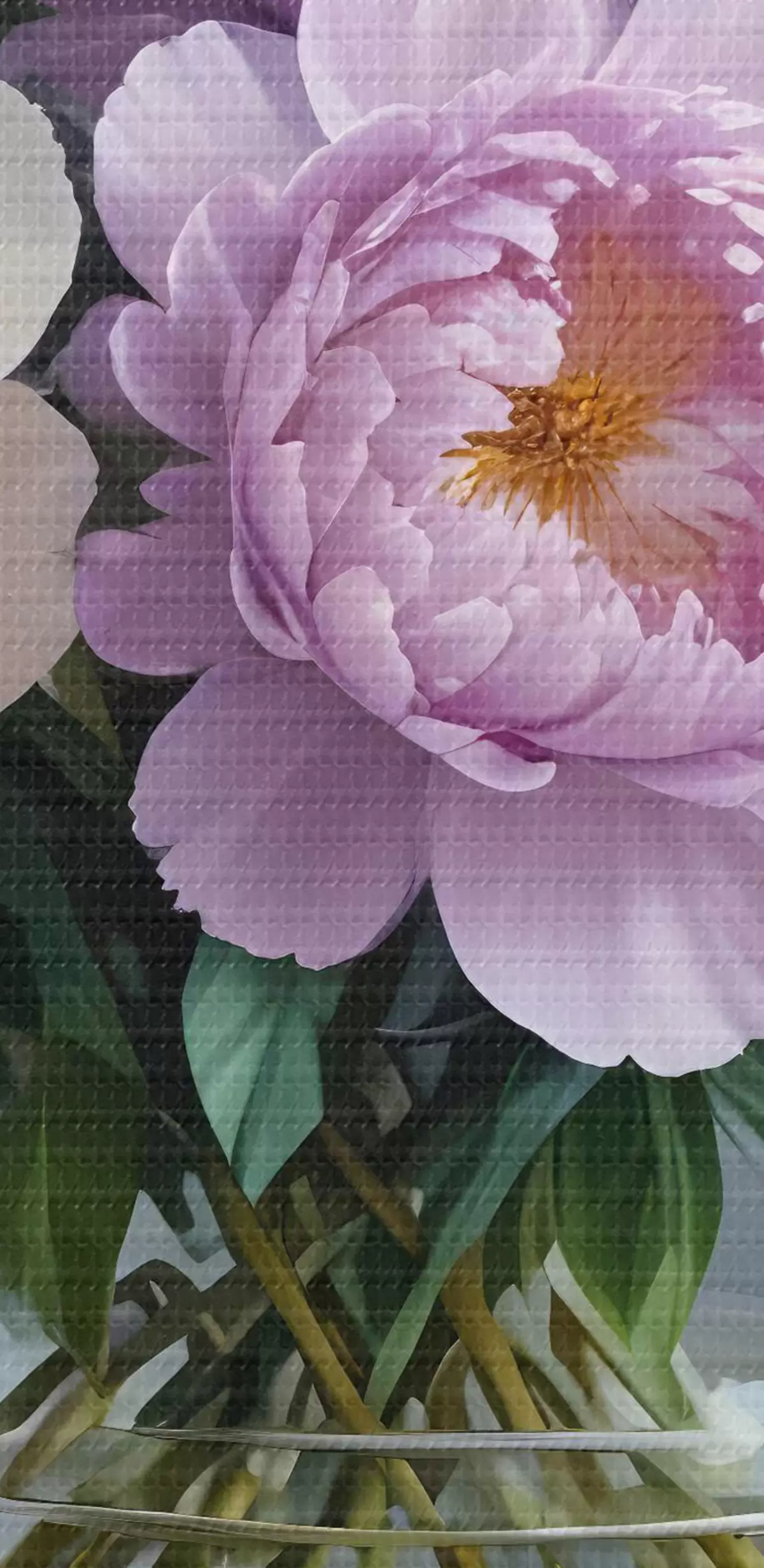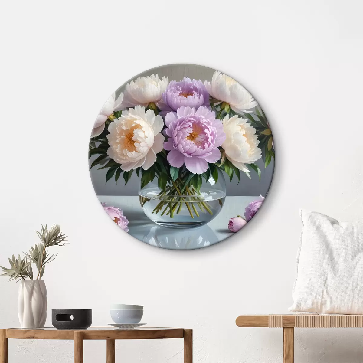 Кругла картина Букет великих, пишних білих і рожевих півоній в скляній вазі на сірому тлі Nr r40610