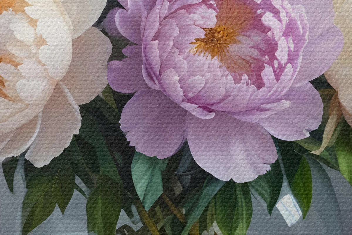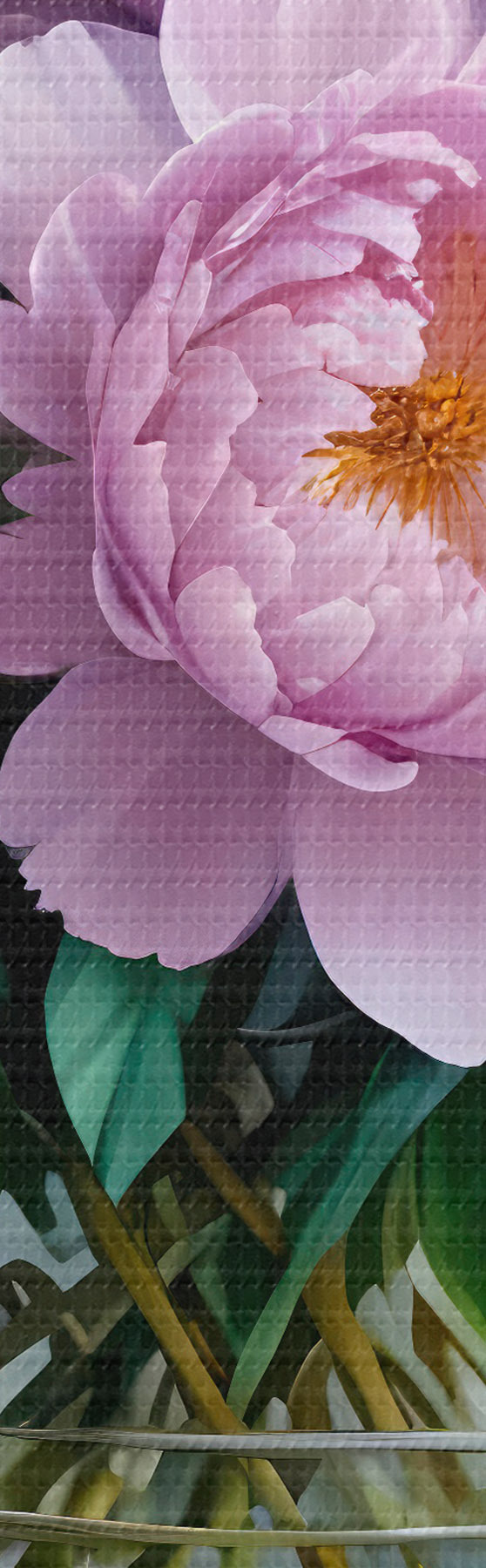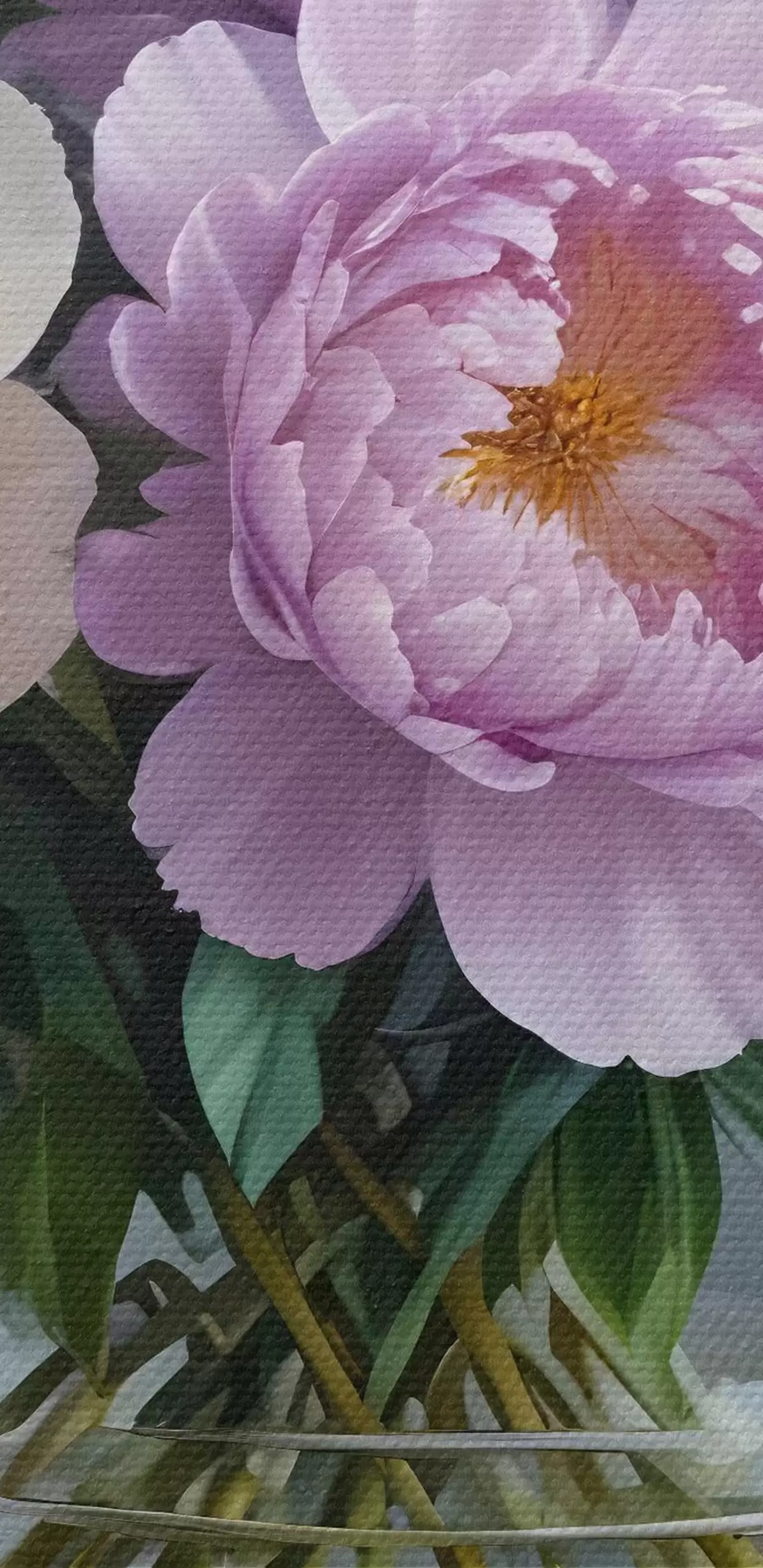 Кругла картина Букет великих, пишних білих і рожевих півоній в скляній вазі на сірому тлі r40610