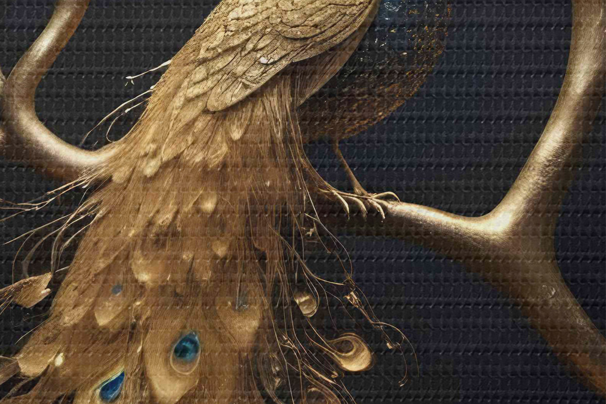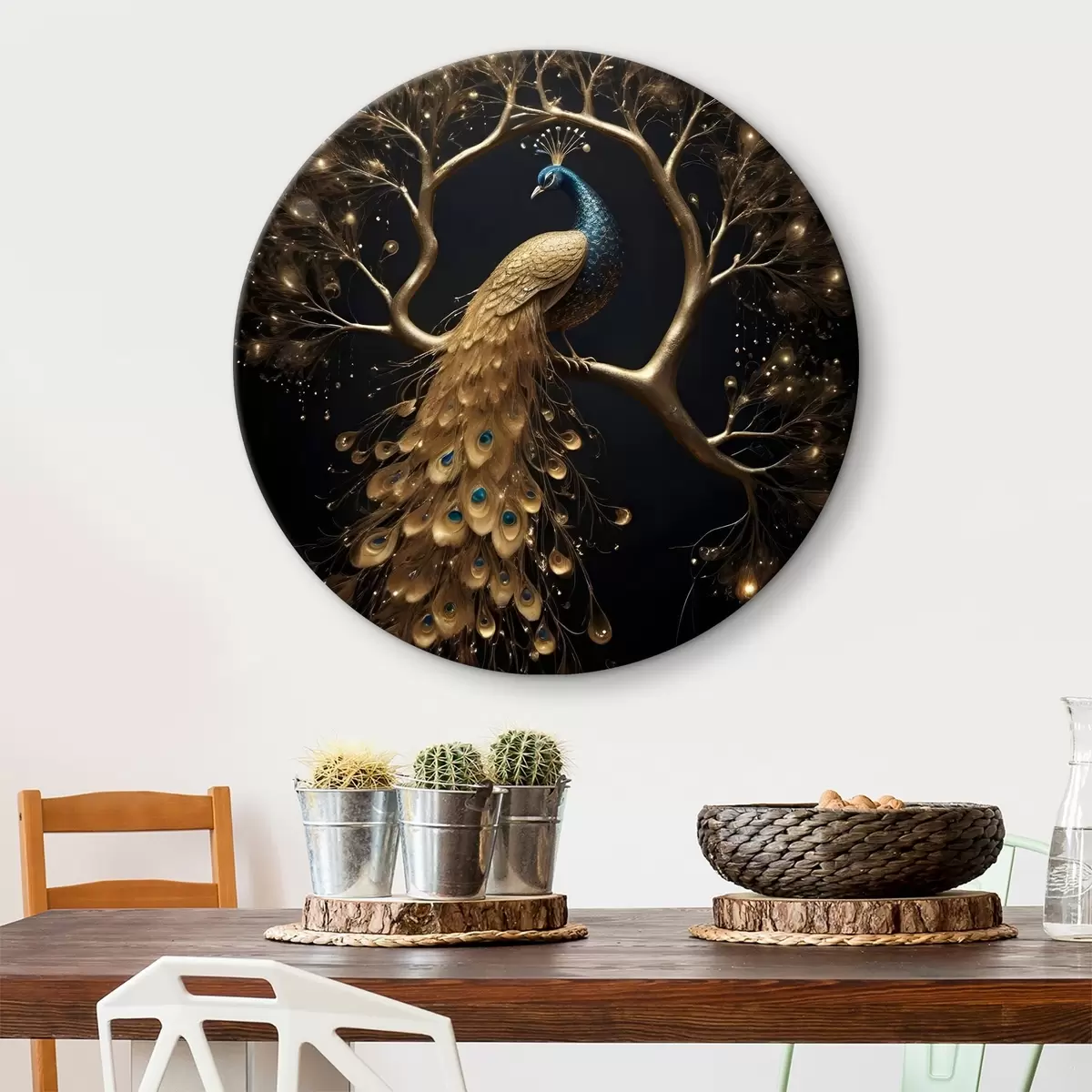 Кругла картина Павич з яскравим пір'ям, що сидить на гілці на темному тлі з деревами, що світяться Nr r40612