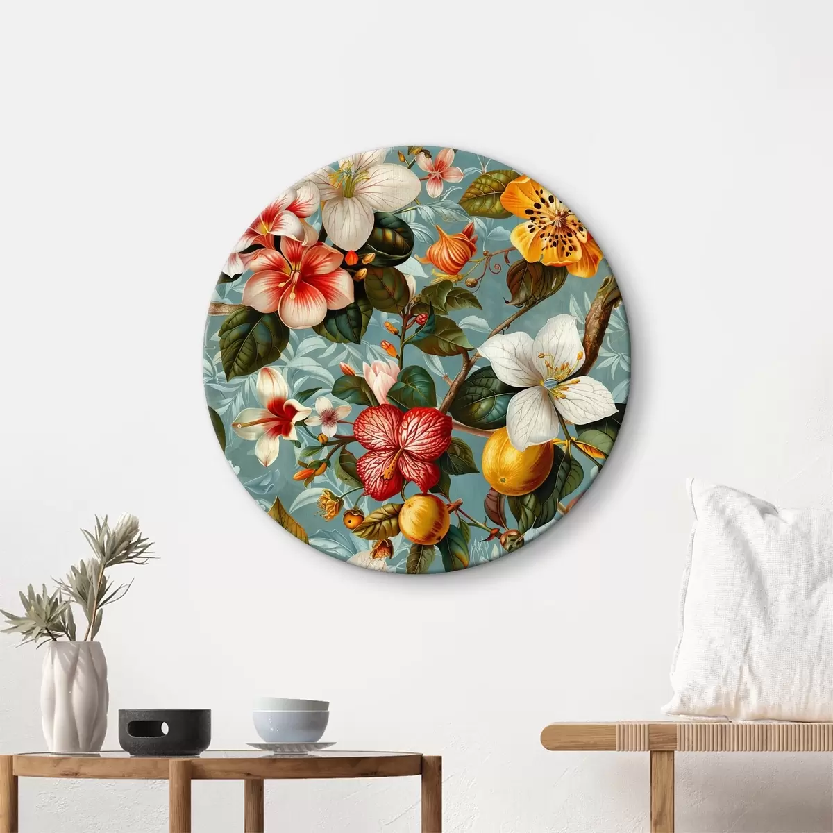 Кругла картина Композиція з різноманітною зеленню та тропічними квітами на синьому тлі Nr r40668