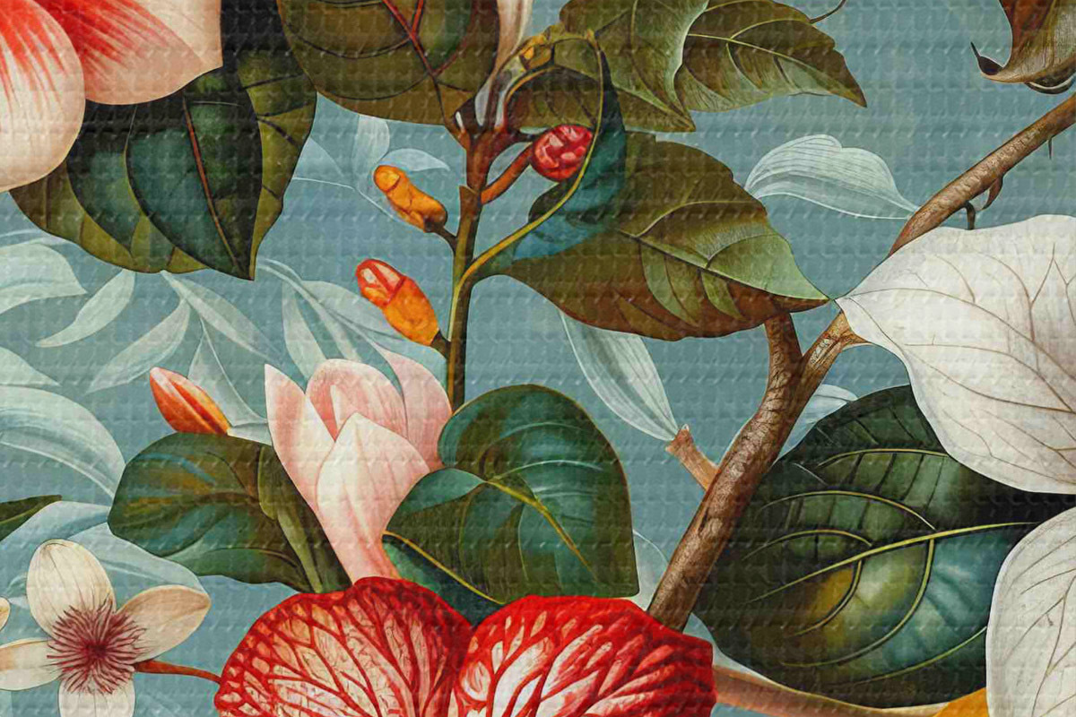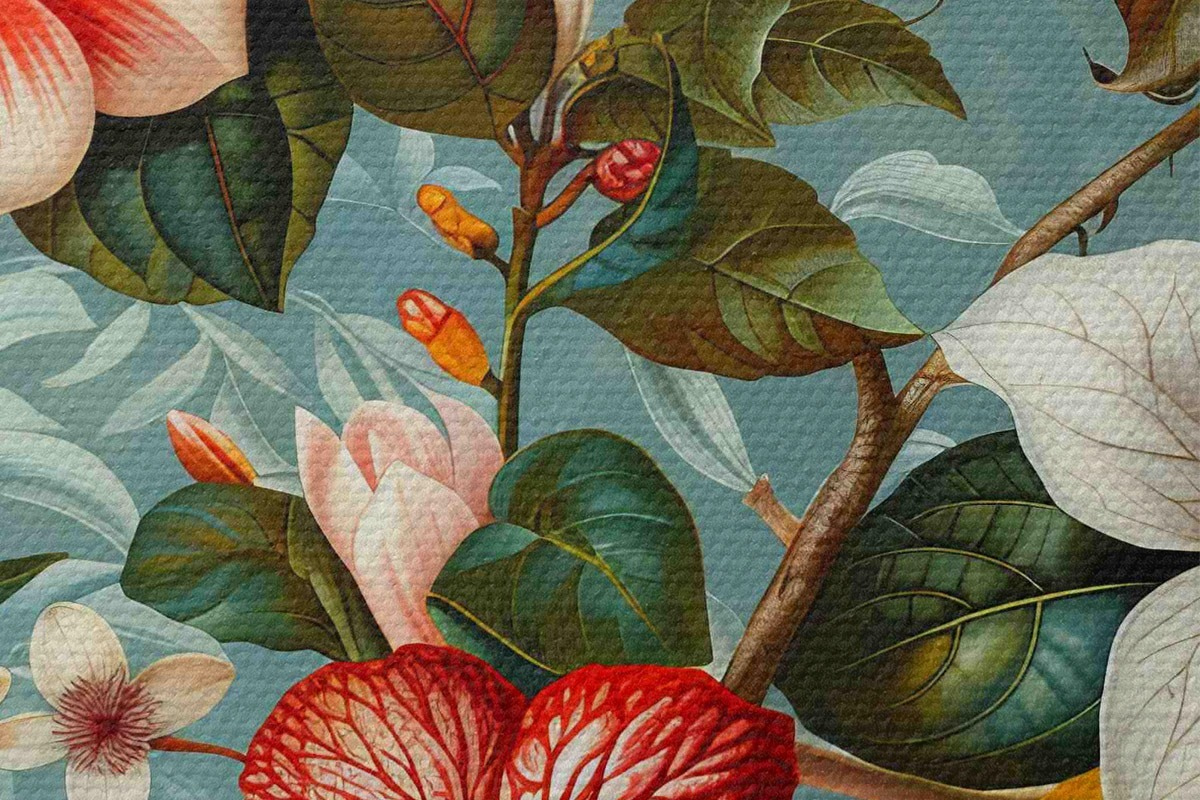 Кругла картина Композиція з різноманітною зеленню та тропічними квітами на синьому тлі r40668