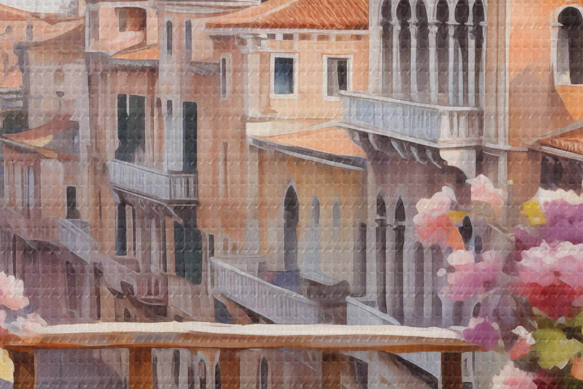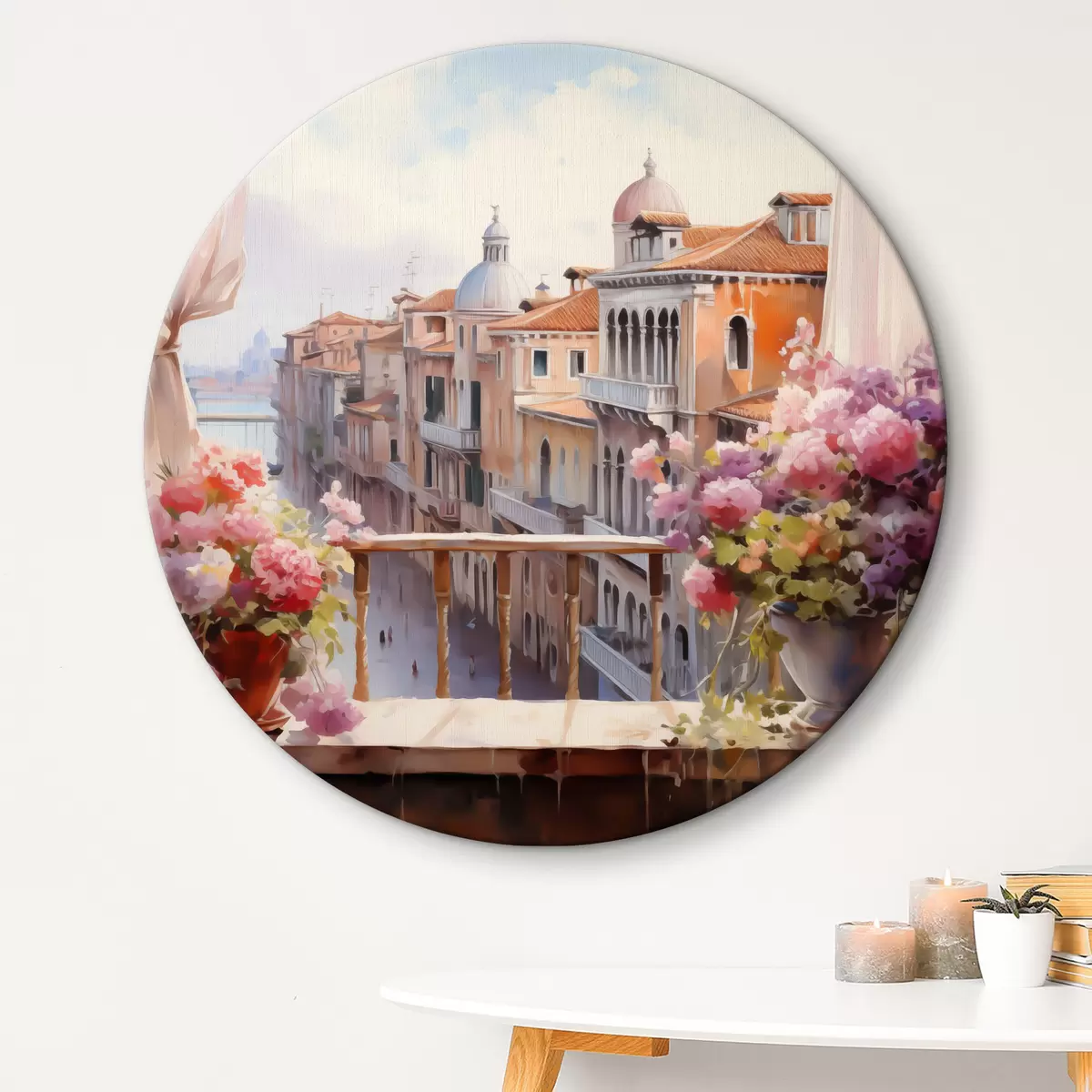Кругла картина Квіти у вазах з видом на затоку у венеціанській акварелі r40677